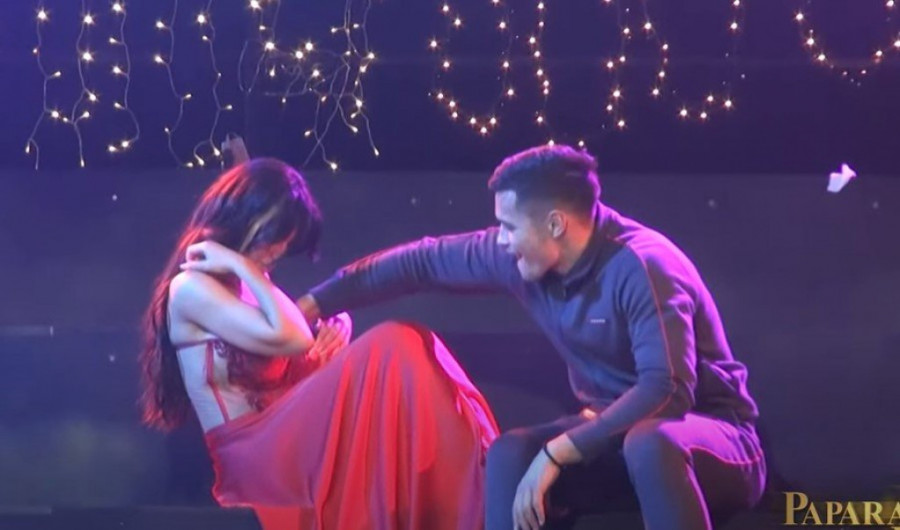 Stanija i njen dečko Marko Marković sedeli su zajedno, a njoj je nešto upalo u dekolte, pa je Marković pokušavao to da izvadi svojim spretnim prstima.