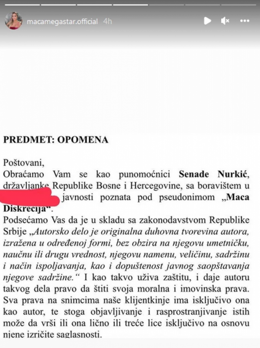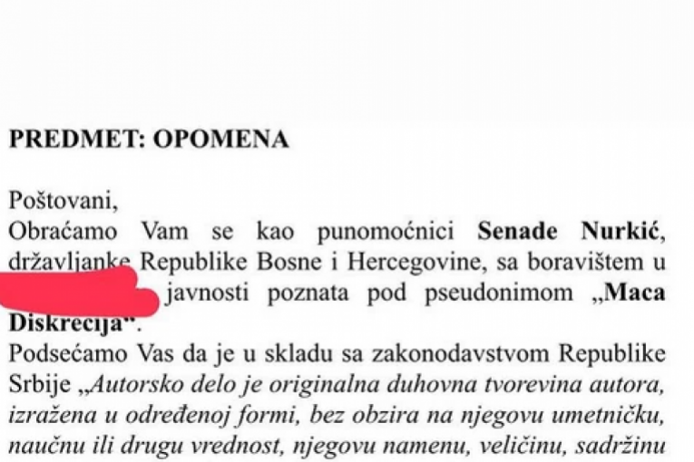- Poštovani, obraćamo Vam se kao punomoćnici Senade Nurkić, državljanke Republike Bosne i Hercegovine, javnosti poznata pod pseudonimom Maca Diskrecija. Podsećamo Vas da je u skladu sa zakonodavstvom Republike Srbije "autorsko delo originalna duhovna tvorevina autora, izražena u određenoj formi, bez obzira na njegovu umetničku, naučnu ili drugu vrednost, njegovu namenu, veličinu, sadržinu i način ispoljavanja, kao i dopuštenost javnog saopštavanja njegove sadržine" i kao takvo uživa zaštitu, i daje autoru takvog dela pravo da štiti svoja moralna i imovinska prava - stoji u ovom dokumentu.