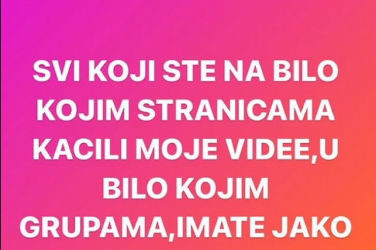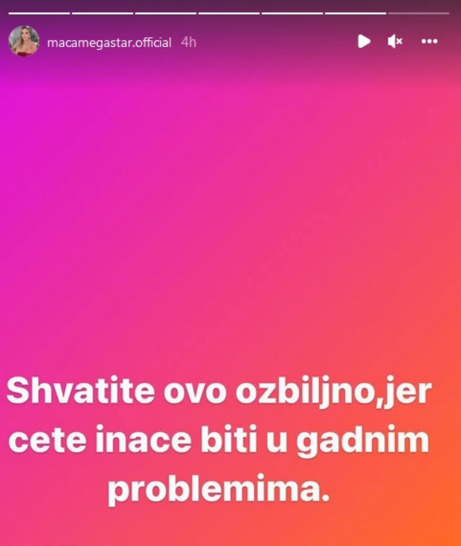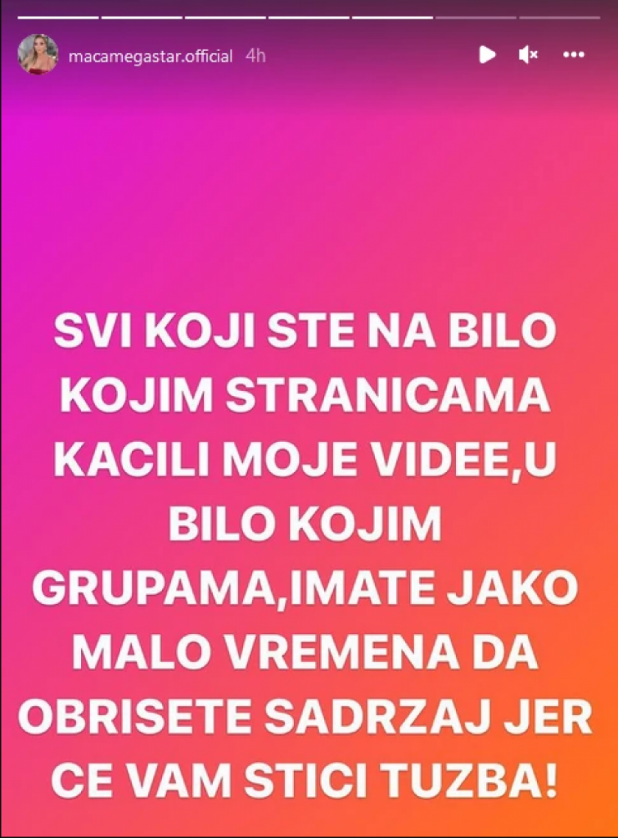 - Sva prava na snimcima naše klijentkinje ima isključivo ona kao autor, te s toga objavljivanje istih može da vrši ili ona lično, ili treće lice isključivo na osnovu njene izričite saglasnosti - dodaje se dalje u dokumentu, na šta je sama Maca poručila: "Svi koji ste na bilo kojim stranicama kačili moje video klipove, u bilo kojim grupama, imate jako malo vremena da obrišete sadržaj jer će vam stići tužba!".