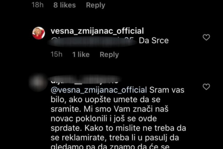 - Sram vas bilo, ako uopšte umete da se sramite. Mi smo vam naš novac znači poklonili i još se srd**e sa nama. Kako to mislite da ne treba da se reklamirate. Treba li u pasulj da gledamo pa da znamo kad će se koncert održati. Čist lopovluk, želim svoj novac natrag - napisala je ona, a onda su se u polemiku uključili i drugi Vesnini fanovi.