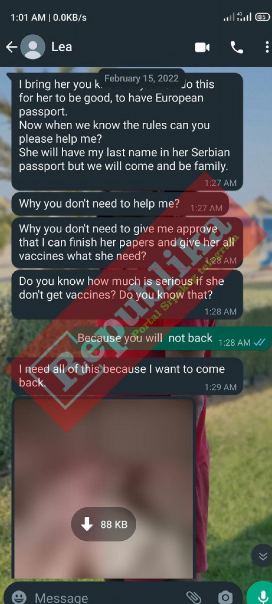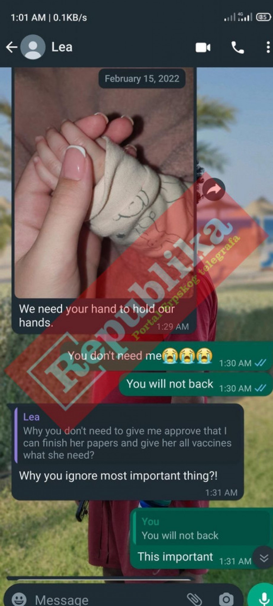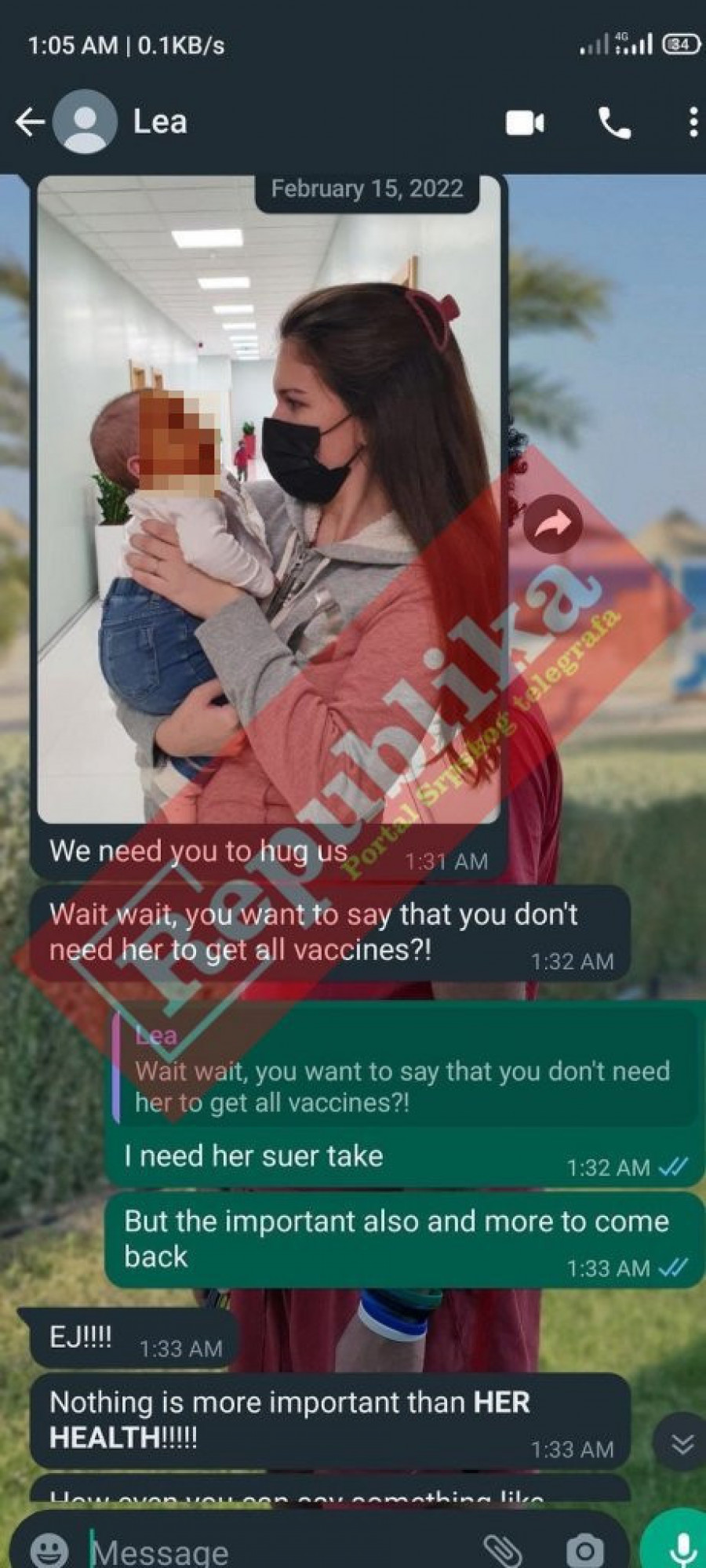 - Otac mog deteta je bio upoznat i saglasan s mojim i detetovim odlaskom za Srbiju i potpisao je sve papire potrebne za dolazak u Srbiju i registraciju deteta kao srpskog državljanina. Ali s našim odlaskom doživeo je otrežnjenje jer je izgubio priliv koji je moja porodica omogućavala, pa je zatražio 75.000 evra da se odrekne svih zakonom zagarantovanih prava (kada je dete u pitanju). Znači, on je procenio da naše dete vredi 75.000 evra. Napominjem da ocu mog deteta nijednog momenta nije rečeno da neće moći da vidi svoju ćerku. On zna na kojoj smo adresi i samo je potrebno da pre toga izvadi putne isprave. U cilju zaštite svog deteta, što njenom ocu, očigledno, nije bio prioritet, po ovom pitanju se više neću oglašavati.