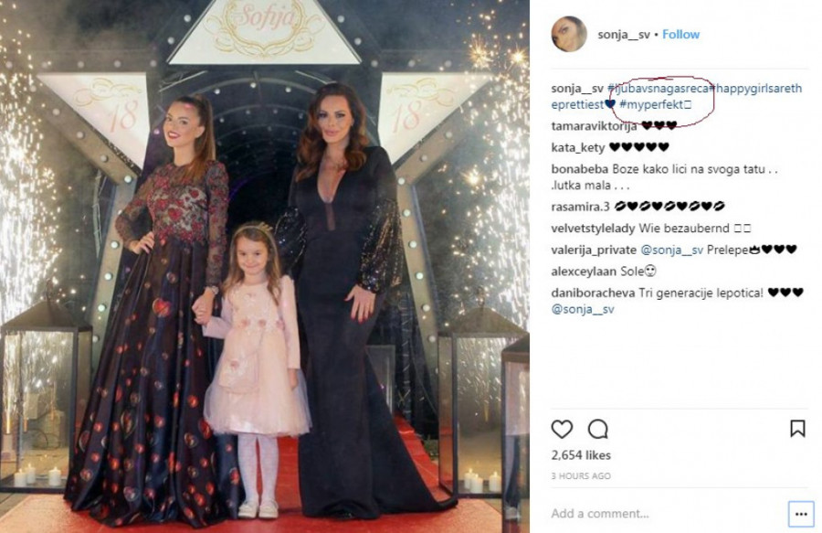 Naime, u želji da se pohvali glamuroznom rođendanskom proslavom koju je organizovala svojoj naslednici Sofiji, Sonja je objavila fotografiju sa ćerkicama prema kojima je ljubav poželela da iskaže na maternjem jeziku, što je bez imalo muke uradila, ali i na engleskom, kako njeni pratioci iz inostranstva ne bi bili uskraćeni za još jednu njenu misao.