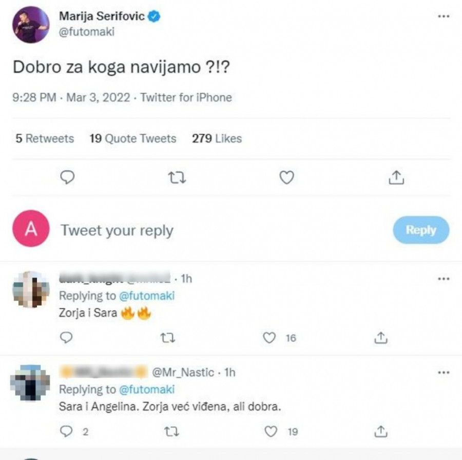 Svi imaju neke svoje fanove i ideje o tome ko će da pobedi, a pevačica Marija Šerifović napravila je haos na društvenoj mreži Tviter kada je postavila jedno pitanje.