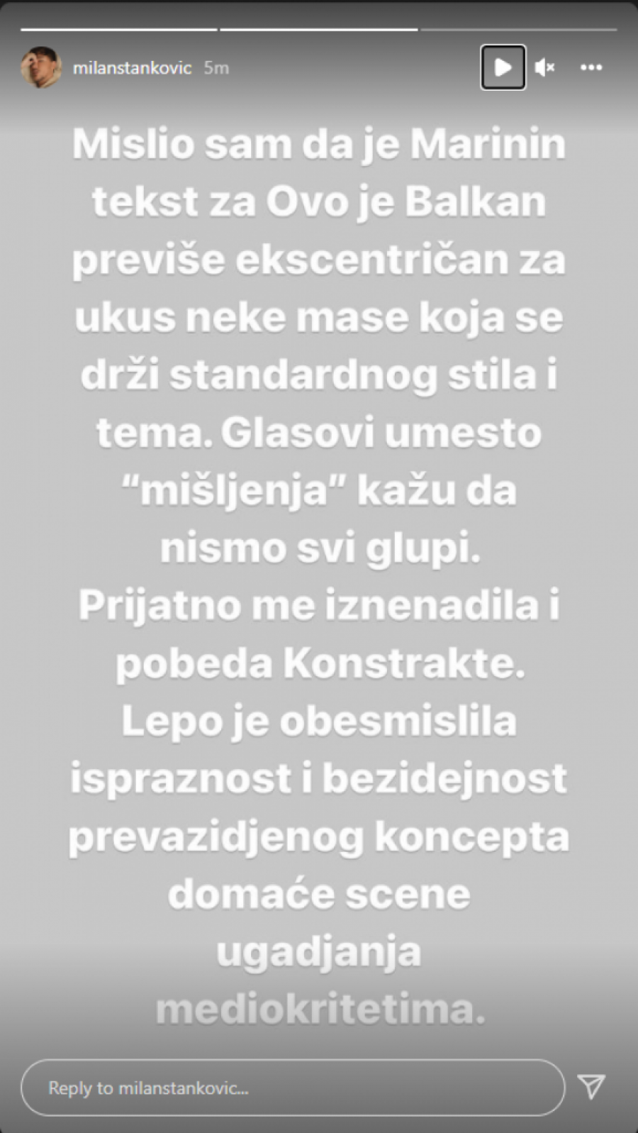 Naime, Milan je na Instagramu naglasio kako ga je Konstraktina pobeda iznenadila jer iskače iz kalupa koji se vezuje za podilaženje publike.