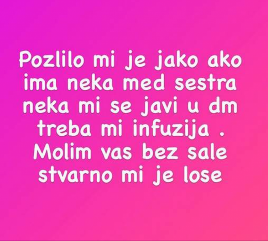 "Pozlilo mi je, jako. Ako ima neka medicinska sestra neka mi se javi, treba mi infuzija. Molim vas, bez šale, stvarno mi je loše", napisala je, pa dodala: