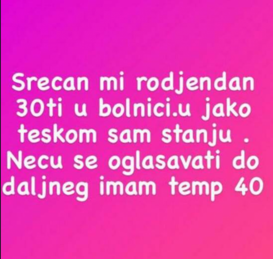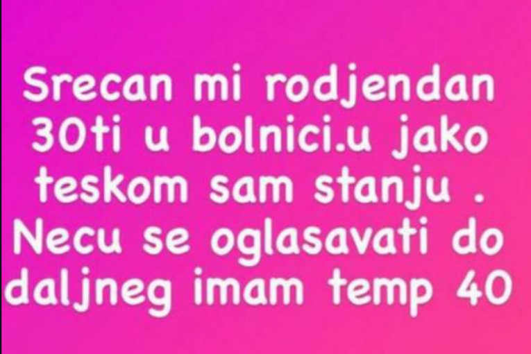 "Srećan mi 30. rođendan u bolnici, U jako teškom sam stanju, neću se oglašavati do daljnjeg. Imam 40 temperaturu", napisala je Anđela.