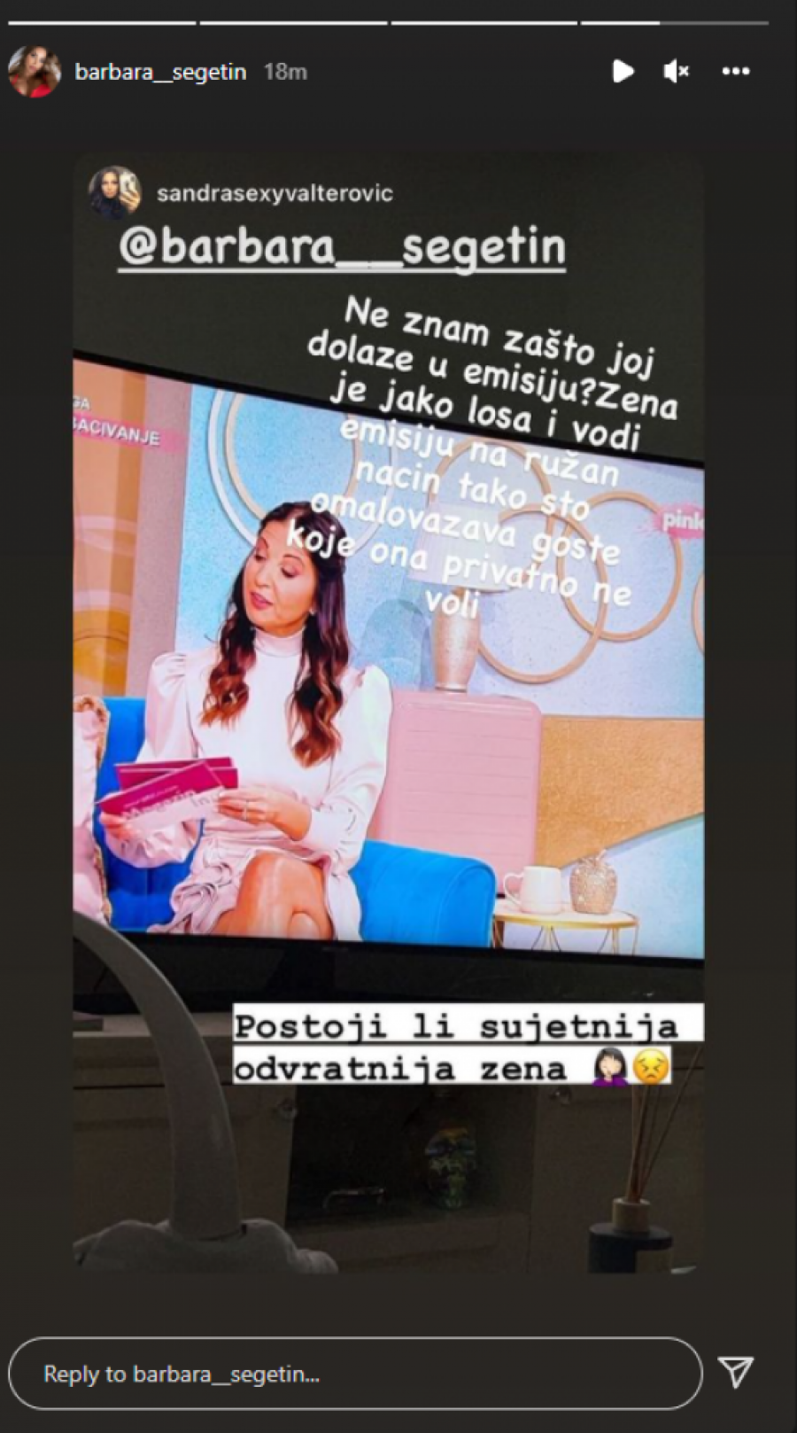 - Ne znam zašto joj dolaze u emisiju. Žena je jako loša i vodi emisiju na jako ružan način tako što omalovažava goste koje ona privatno ne voli - nadovezala se Sandra na Barbarinu Insta priču.