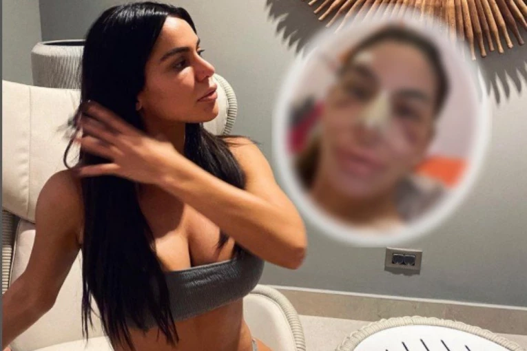 Iako je na snimku koji je objavila iz bolnice koristila filter, jasno se vide modrice ispod očiju i zavoji i flasteri preko nosa.
