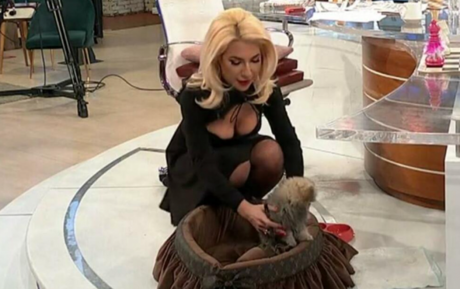 Na oduševljenje svih prisutnih, Jovana je sela na stepenik i čučnula u miniću, mazeći štene kome je dala simbolično ime Šer, zbog gledanosti emisije.
