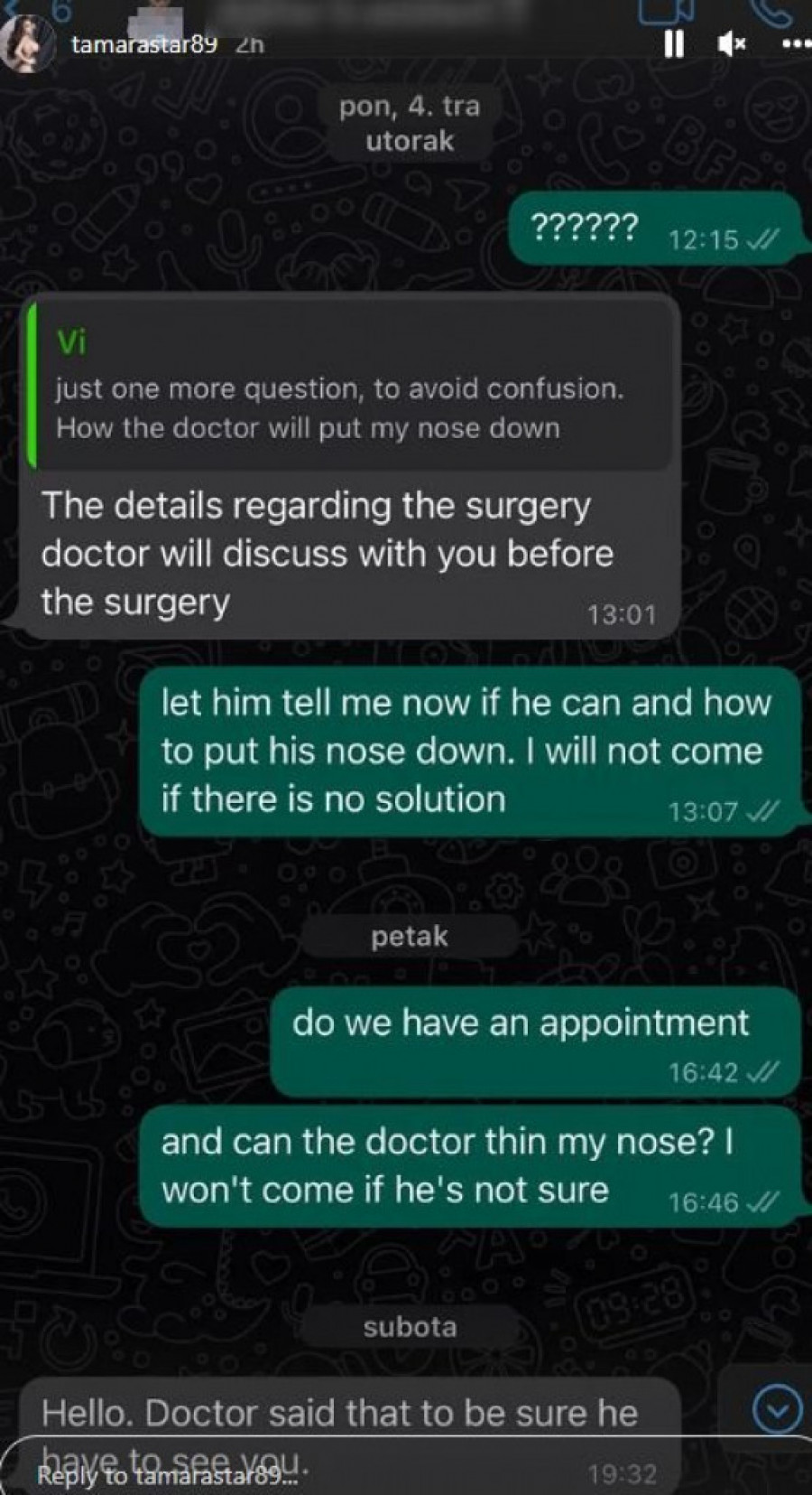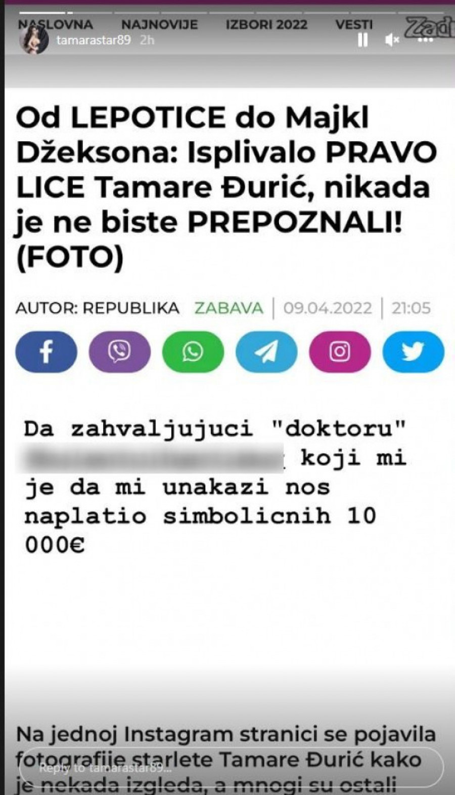 Tamara Đurić skroz je nezadovoljna kako joj izgleda nos posle operacije. Starleta se oglasila na svom Instagram profilu, štaviše pozivajući se i na naš tekst. Kontaktirali smo Tamaru ne bi li saznali šta se tačno dešava.