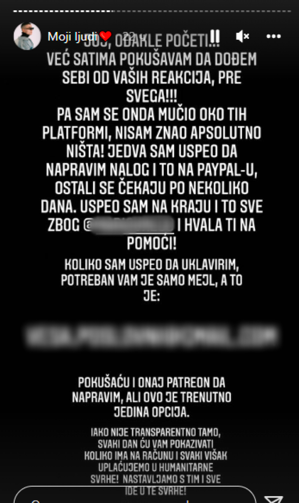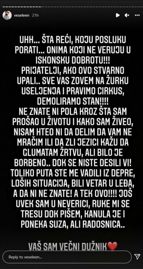 - Uh šta reći, koju poruku poslati. Onima koji ne veruju u iskonsku dobrotu. Prijatelji, ako ovo stvarno upali, sve vas zovem na žurku useljenja i pravimo cirkus. Demoliramo stan. Ne znate ni pola kroz šta sam prošao u životu i kako sam živeo. Nisam hteo ni da vam delim da vas ne mračim ili da zli jezici kažu da glumatam žrtvu, ali bilo je borbeno, dok se niste desili vi. Toliko puta ste me vadili iz depresije, loših situacija, bili vetar u leđa, a da ni ne znate, a tek ovo, još uvek sam u neverici, ruke mi se tresu dok pišem, kanula je po neka suza radosnica - napisao je influenser, pa je u narednom storiju dodao: