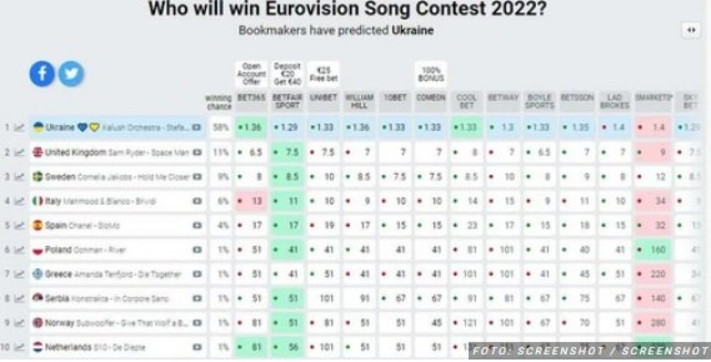 Favorit je i dalje Ukrajina, dok je na drugom mestu Velika Britanija.