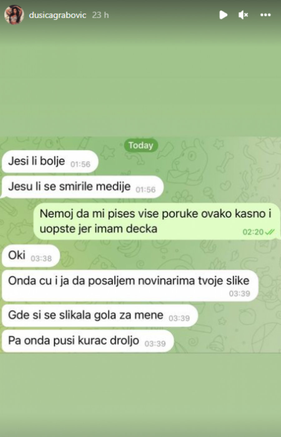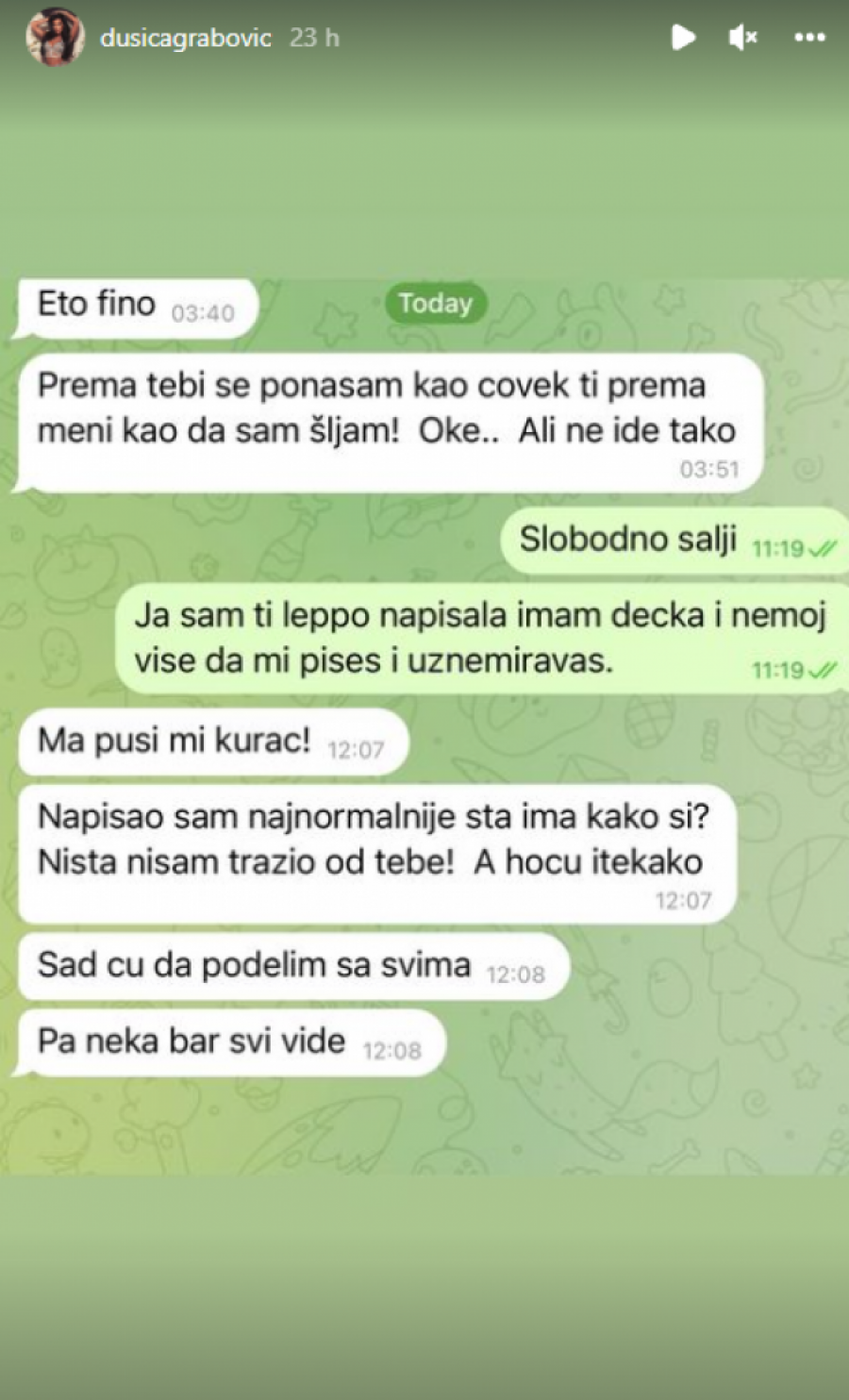 - Ja sam to skrinšotovala, u slučaju da izađu neke moje gole slike na kojima se i vidi i ne vidi da sam ja, nebitno je. Bili smo u vezi, slali smo jedno drugom slike, to je normalno, ali da ti muškarčino... Da na osnovu toga želiš da dospeš u novine, preko mene i da objavljuješ moje gole slike. Pa da li imaš sestru, majku, nekoga ko je žensko dete? Da razmišljaš o njima kako bi se tvoja majka osećala da tvojoj sestri izađu gole slike u novine, samo to da te pitam. Pošto će on videti da sam ja ovo objavila i neka vidi, pošto me prati sa lažnih profila, jer je na svim ostalim blokiran.
