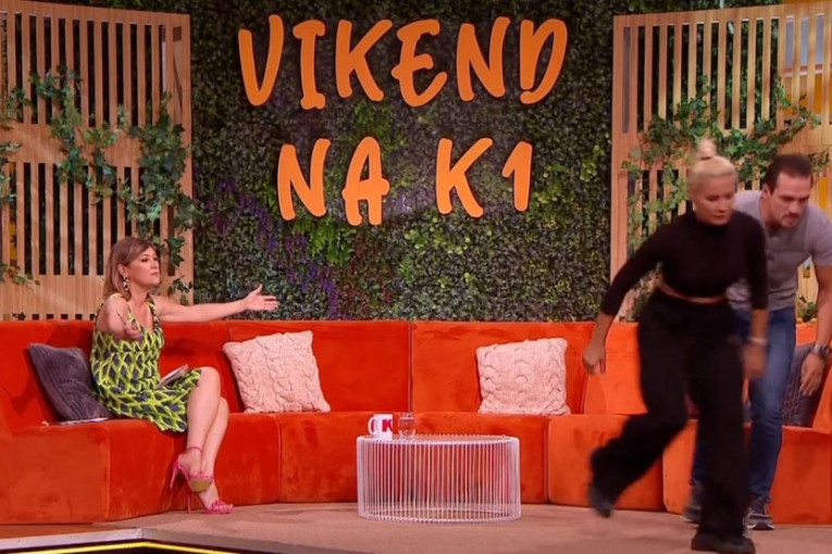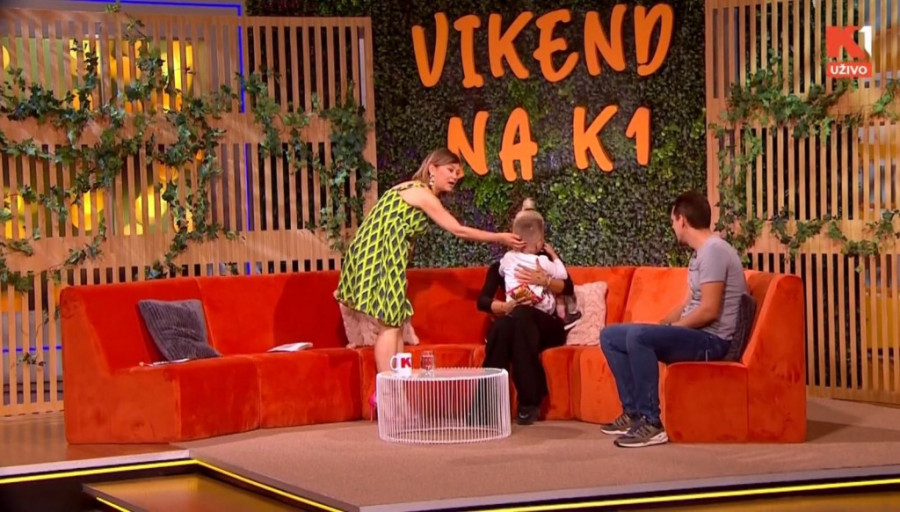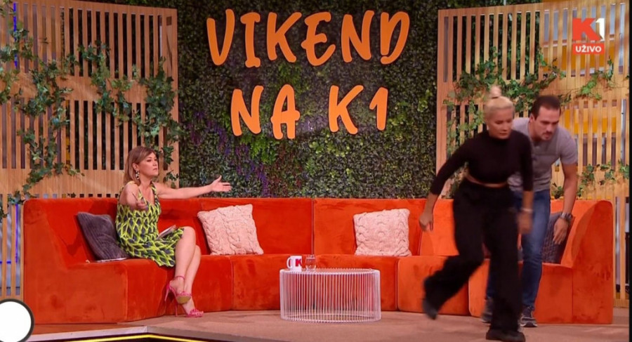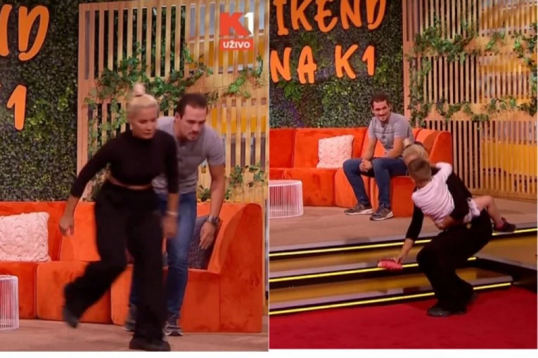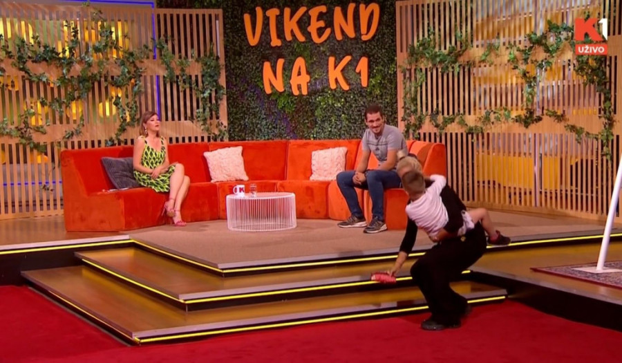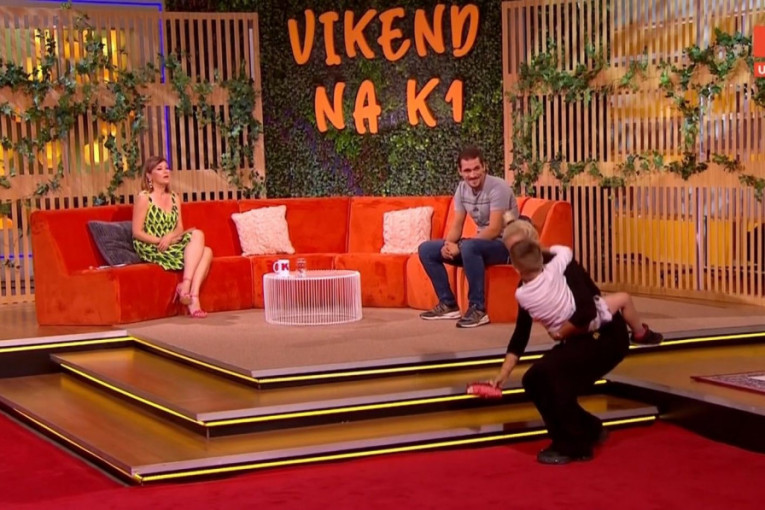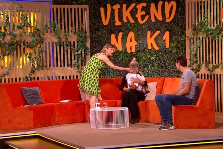 Košarkašica Milica Dabović danas je gostovala uživo u emisiji "Vikend na K1", pa je tako izletela iz studija kada je njen naslednik Stefan pao kada je hteo da se popne na scenografiju.