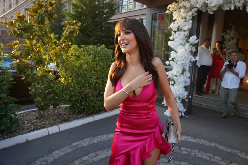 Ona je ponela satensku haljinu pink-ciklama boje koja je odlično pristala uz njeno telo.