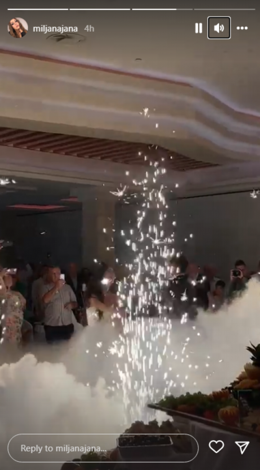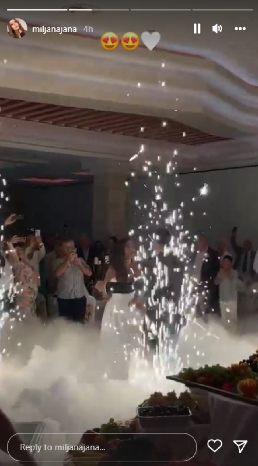 Egelja je nosila dugačku belu venčanicu sa korsetom, a sve vreme je bila nasmejana i vesela. Na Instagramu se pojavio i snimak na kom mladenci plešu svoj prvi ples uz Bajinu pesmu "Od ljubavi jače".