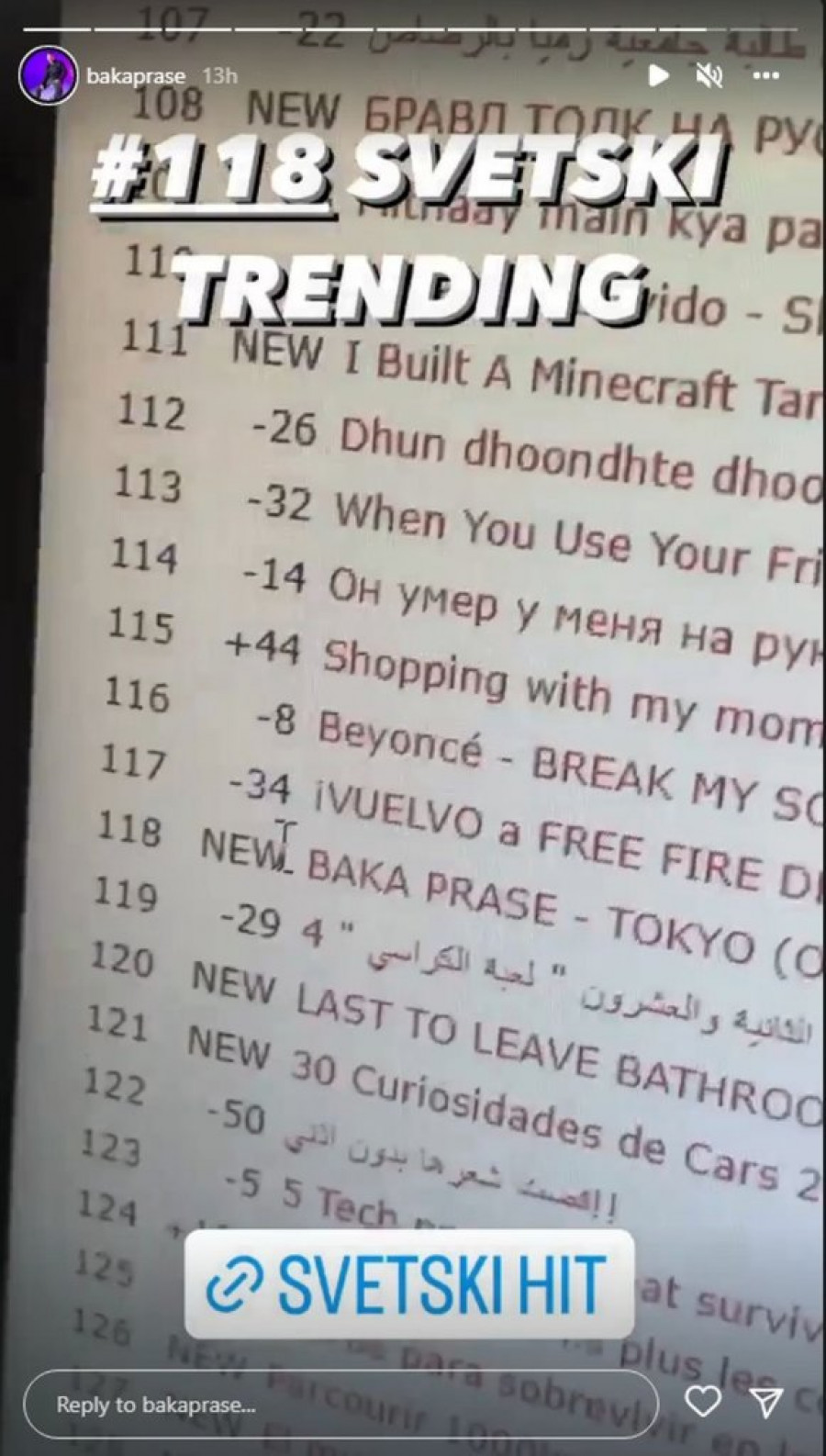 Ali to nije sve, Baka se na društvenoj mreži Instagram ubrzo pohvalio da se njegov novi hit našao i u svetskoj trending listi, tačnije da je zauzeo visoko 118 mesto odmah iza svetske zvezde Bejonse.