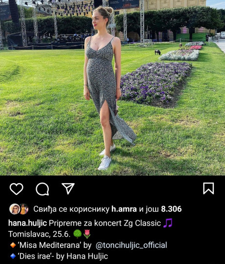 Trudna Hana Huljić koja sa pevačem Petrom Grašom očekuje ćerkicu, porodiće se u narednih mesec dana, ali je to ne sprečava da radi. Naime, iako su je svi upozoravali da je priprema za koncert stresna za njeno stanje, Hana je zapevala uz svog oca Tončija Huljića u hrvatskoj prestonici