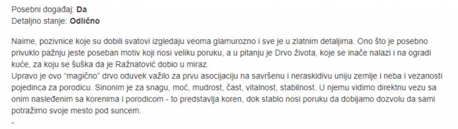 - Naime, pozivnice koje su dobili svatovi izgledaju veoma glamurozno i sve je u zlatnim detaljima. Ono što je posebno privuklo pažnju jeste poseban motiv koji nosi veliku poruku, a u pitanju je Drvo života, koje se inače nalazi i na ogradi kuće, za koju se šuška da je Ražnatović dobio u miraz. Upravo je ovo “magično” drvo oduvek važilo za prvu asocijaciju na savršenu i neraskidivu uniju zemlje i neba i vezanosti pojedinca za porodicu. Sinonim je za snagu, moć, mudrost, čast, vitalnost, stabilnost. U njemu vidimo direktnu vezu sa onim nasleđenim sa korenima i porodicom - to predstavlja koren, dok stablo nosi poruku da dobijamo dozvolu da sami potražimo svoje mesto pod suncem - piše u opisu fotografija.