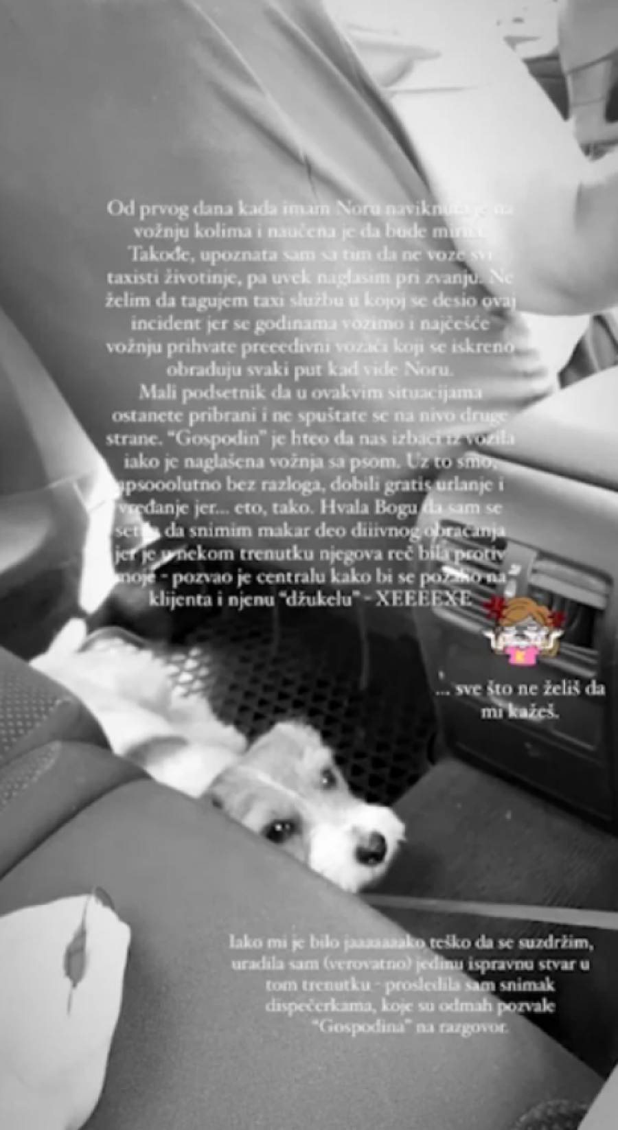 - Od prvog dana kada imam Noru naviknuta je na vožnju kolima i naučena je da bude mirna. Takođe, upoznata sam sa tim da ne voze svi taksisti životinje, pa uvek naglasim prvi zvanju. Ne želim da tagujem taksi službu u kojoj se desio ovaj incident jer se godinama vozimo i najčešće vožnju prihvate predivni vožači koji se iskreno obraduju svaki put kad vide Noru. Mali podsetnik da u ovakvim situacijama ostanete pribrani i ne spuštate se na nivo druge strane.