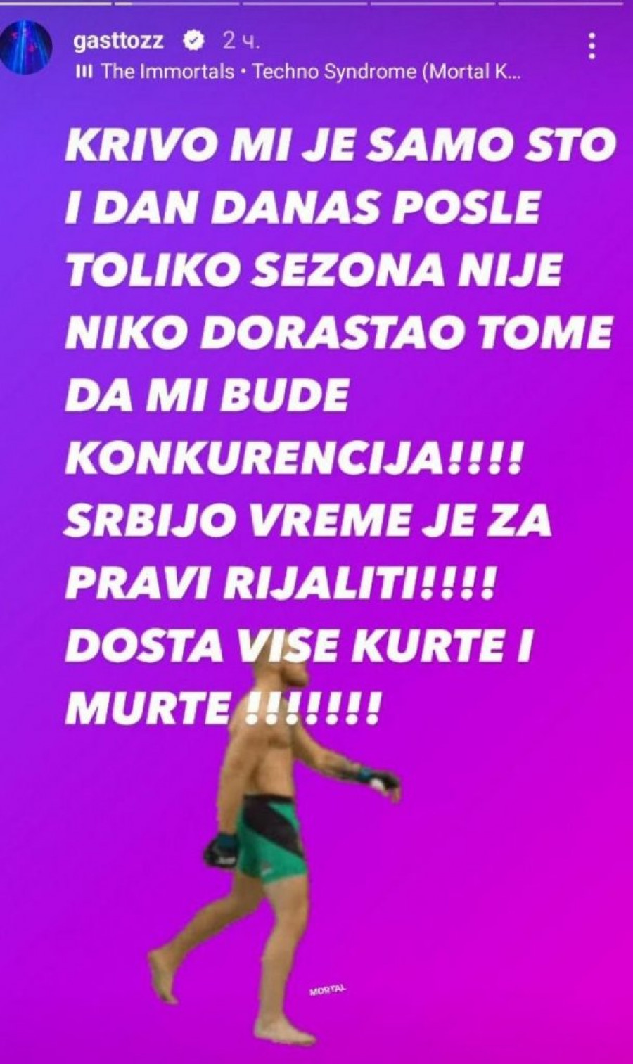 - Krivo mi je samo što i dan danas posle toliko sezona niko nije dorastao tome da mi bude konkurencija! Srbijo, vreme je za pravi rijaliti! Dosta više kurte i murte! - napisao je Gastoz na svom Instagramu.
