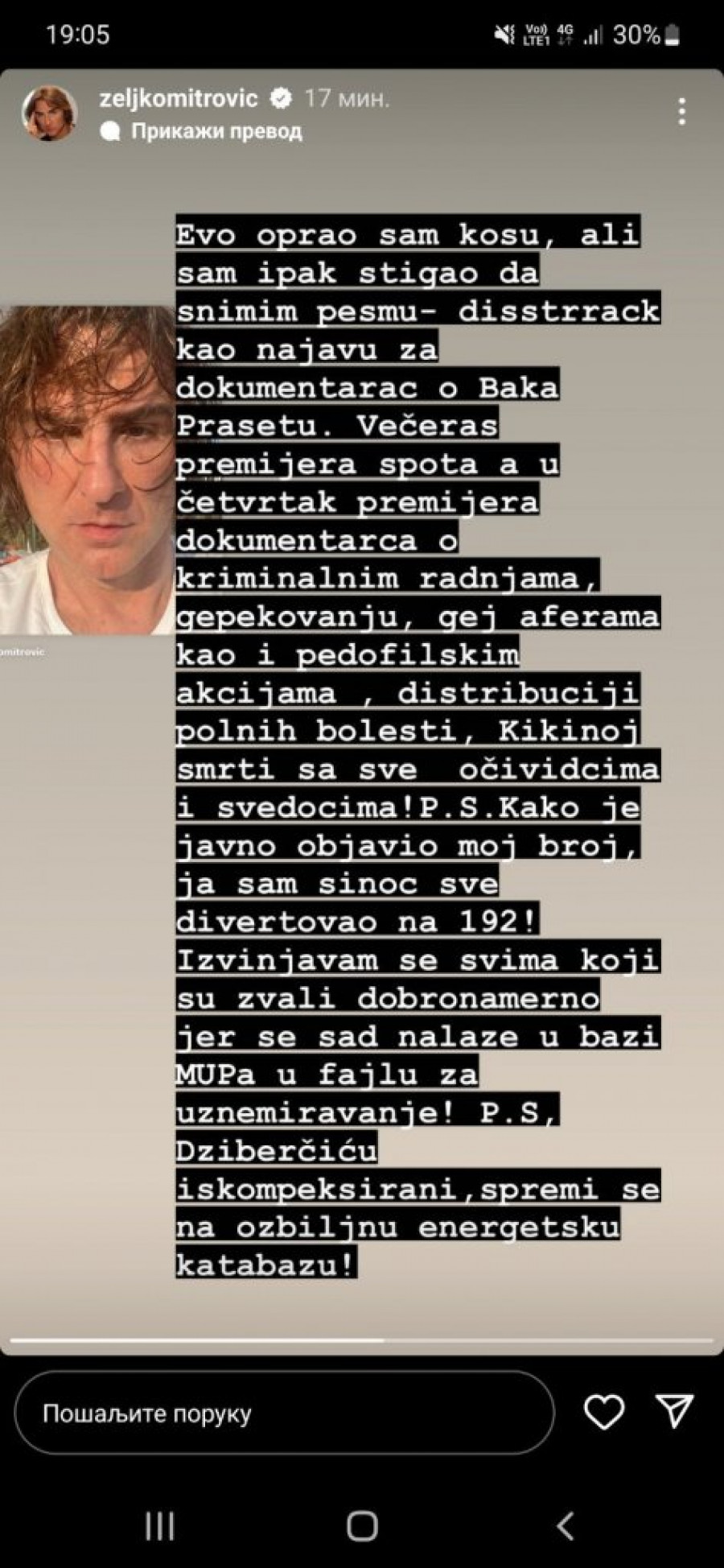 - Uskoro će Baka Prase na službenu stolicu za utaju poraza i zlostavljanja maloletnih devojčica, kao i finansiranja kriminalnog klana Veljka Belivuka - napisao je pre neki dan Željko na Instagramu.