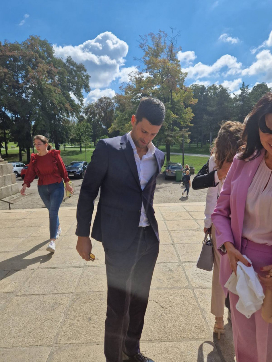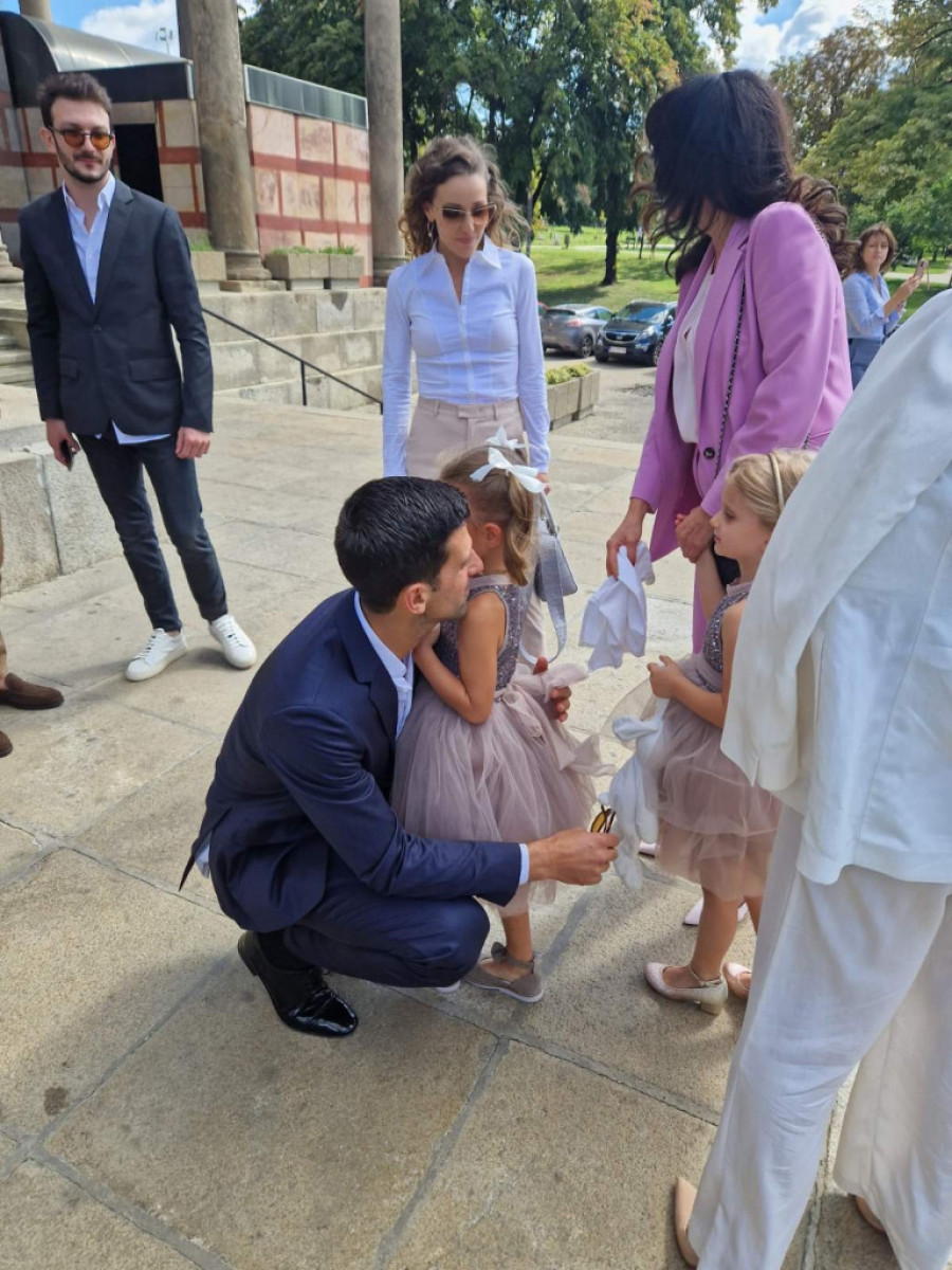 Majka Dijana Đoković i otac Srđan Đoković sreću ne mogu da sakriju. Novak i Jelena došli su sa decom, a najbolji teniser sveta trubačima deli novac i šakom i kapom.