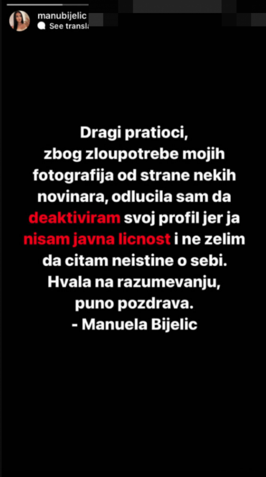 - Dragi pratioci, zbog zloupotrebe mojih fotografija odlučila sam da deaktiviram svoj profil, jer ja nisam javna ličnost i ne želim da čitam neistine o sebi. Hvala na razumevanju, puno pozdrava. Manuela Bijelić - pisalo je u objavi koju je podelila Manuela, koja je potom deaktivirala svoj profil na ovoj društvenoj mreži.