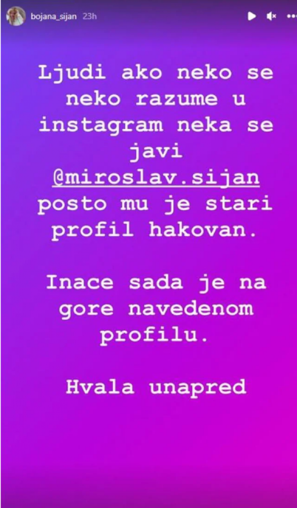 - Ljudi, ako se neko razume u Instagram, neka se javi Miroslavu Šijanu, pošto mu je stari profil hakovan. Hvala unapred - napisala je Bojana.