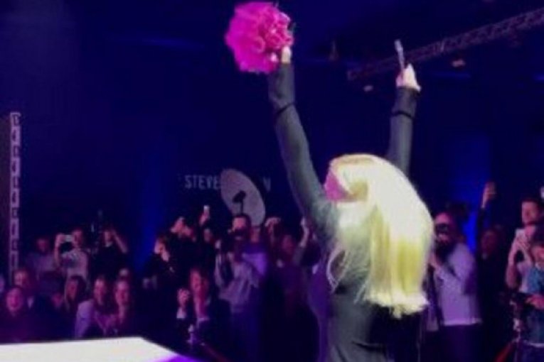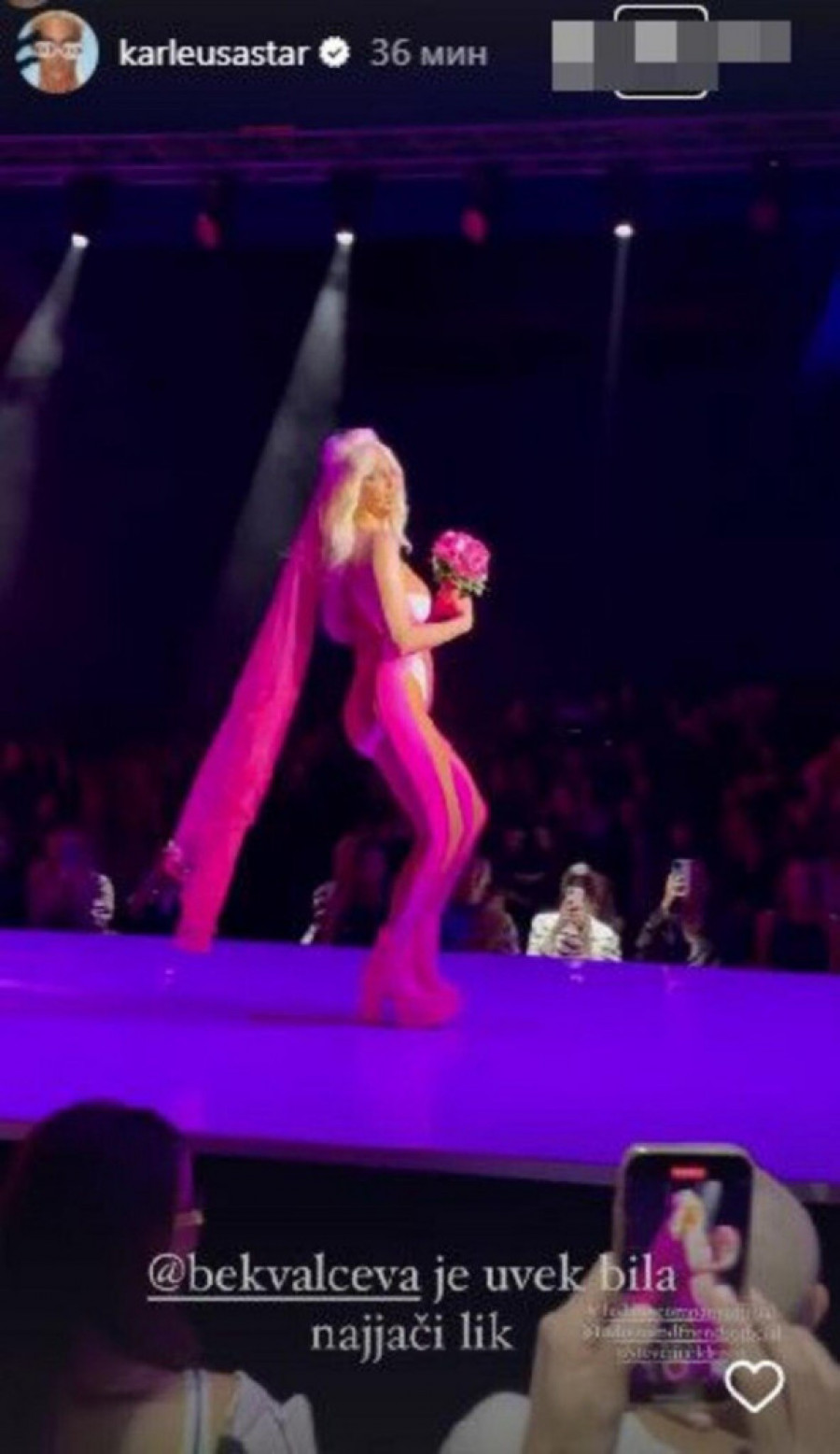 Na pomenutoj reviji je bila i Nataša Bekvalac, koja je sedela u prvom redu, a kada je Karleuša, glumeći da briše suze, bacila bidermajer prema publici, njena koleginica koja se već triput razvodila skočila je i uhvatila ga.
