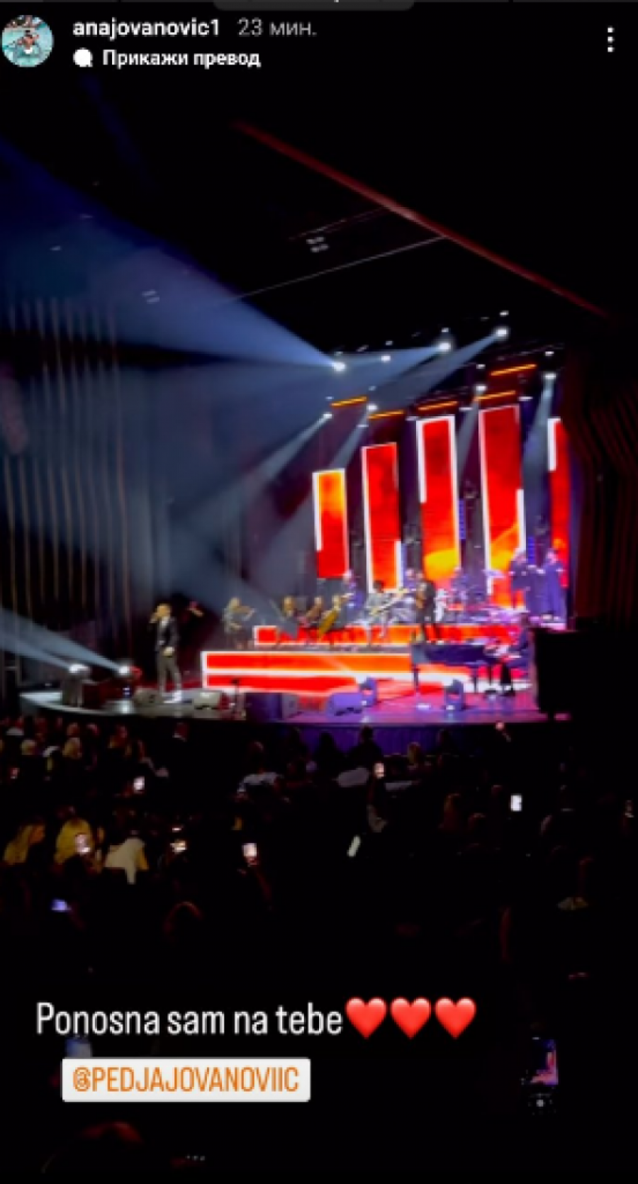 Međutim, najveću pažnju je privukla njegova bivša supruga Ana Jovanović koja je bila u publici i podržavala svog bivšeg partnera, a snimke sa koncerta podelila je i na društvenoj mreži Instagram gde je napisala da je preponosna na Peđu.