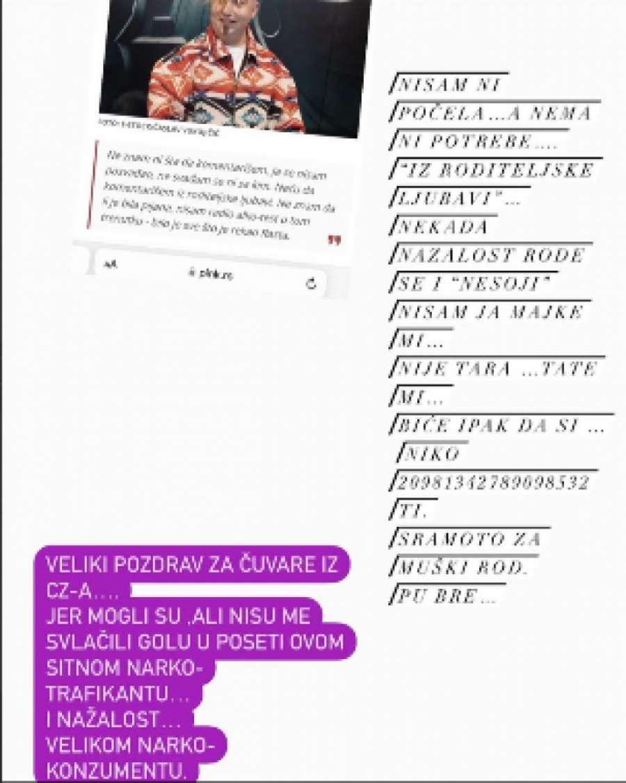 - Nisam ni pročitala, a nema ni potrebe... "Iz roditeljske ljubavi" nekada nažalost rode se i "nesoji", nisam ja majke mi... Nije Tara, tate mi.. Biće ipak da si niko. Ti, sramota za muški rod. Pu, bre - napisala je Ana i dodala:
