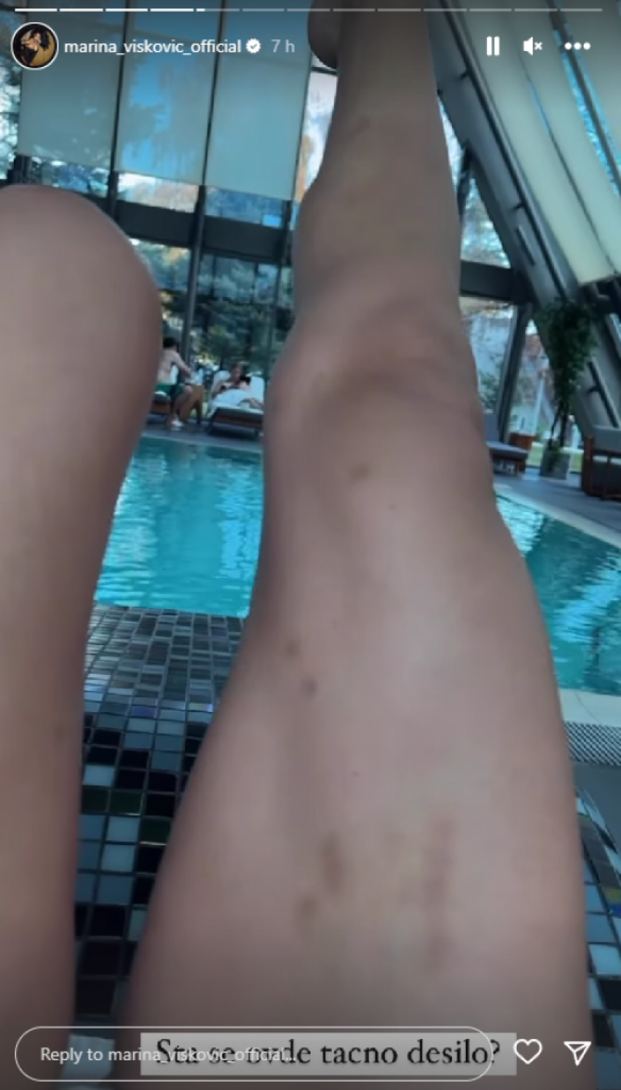 Međutim, veliku pažnju privukle su njene modrice, koje je pevačica objavila na Instagram storiju, koje su izazvale polemiku. Marina ni sama nije znala odakle su joj se pojavile modrice i podlivi duž noge.