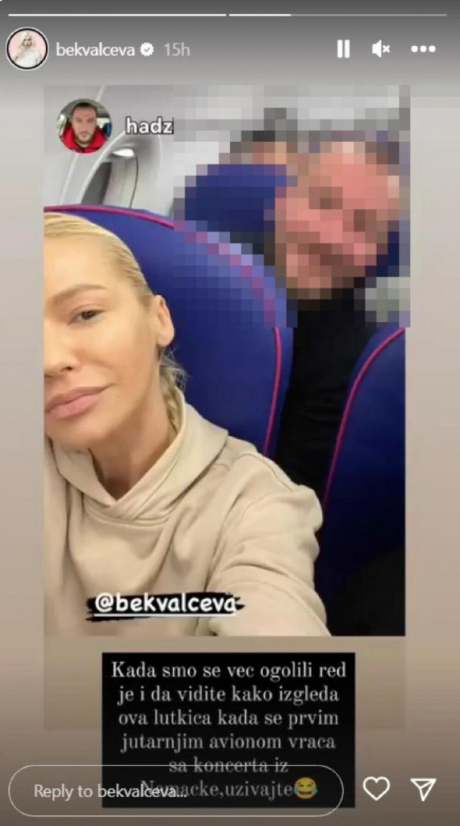 Naime, Bekvalčeva je iskoristila vreme pre poletanja aviona da napravi jutarnji selfi kojim je poručila fanovima da je vreme da se potpuno ogoli pred njima.