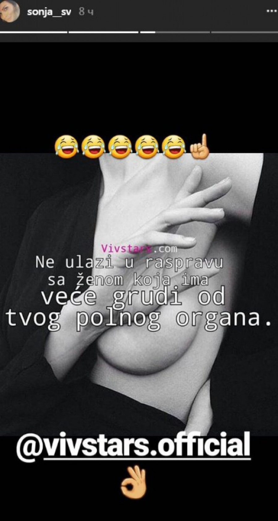 - Ne ulazi u raspravu sa ženom koja ima veće grudi od tvog polnog organa - poručila je Sonja i samim tim prozvala određenog pripadnika jačeg pola.