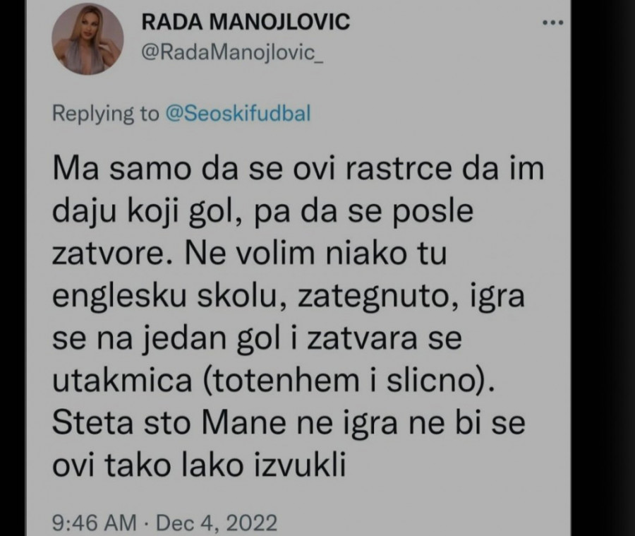 - Ma samo da se ovi rastrče da im daju koji gol, pa da se posle zatvore. Ne volim nikako tu englesku školu, zategnuto, igra se na jedan gol i zatvara se utakmica (Totenhem i slično). Šteta što Mane ne igra, ne bi se ovi tako lako izvukli - poručila je pevačica, a zatim su usledili urnebesni komentari.