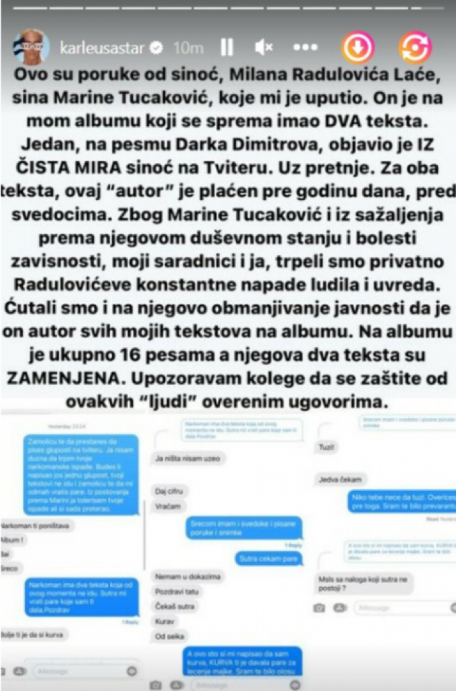 -Ovo su poruke od sinoć, Milana Radulovića Laće, sina Marine Tucaković, koje mi je uputio. On je na mom albumu koji se sprema imao DVA teksta. Jedan, na pesmu Darka Dimitrova, objavio je IZ ČISTA MIRA sinoć na Tviteru. Uz pretnje. Za oba teksta, ovaj "autor" je plaćen pre godinu dana, pred svedocima. Zbog Marine Tucaković i iz sažaljenja prema njegovom duševnom stanju i bolesti zavisnosti, moji saradnici i ja, trpeli smo privatno Radulovićeve konstantne napade ludila i uvreda - istakla je pevačica, pa dodala: