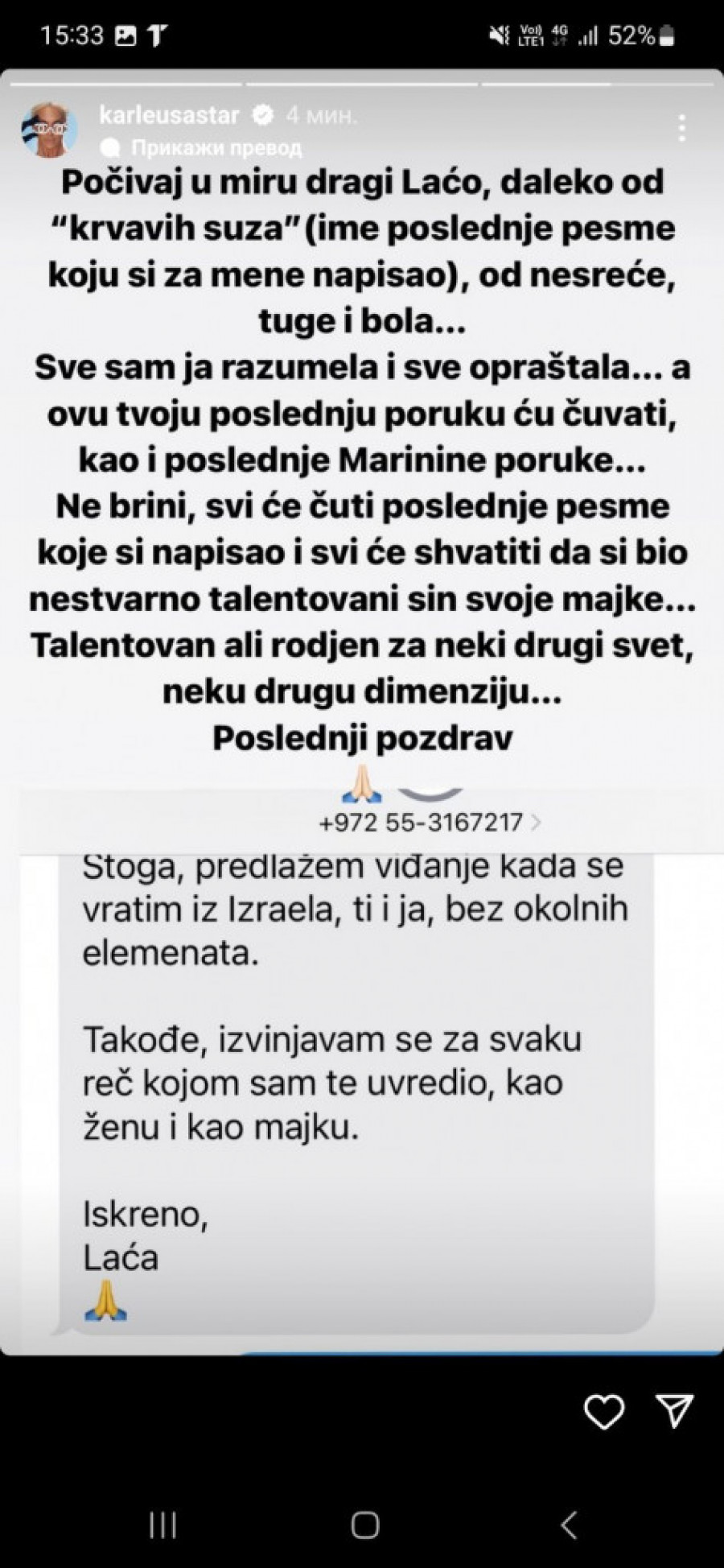 Karleuša se sada oprostila od Laće na Instagramu tako što je objavila poslednju prepisku sa njim, u kojoj je on pred smrt oprašta sve što su izrekli jedno drugom.