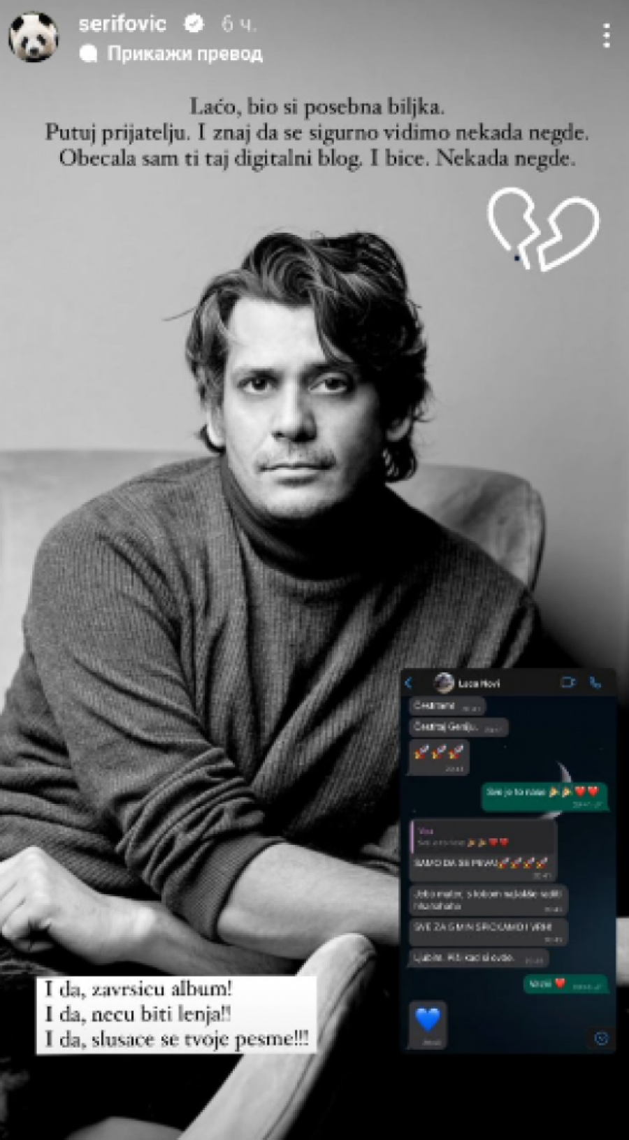 - Laćo, bio si posebna biljka. Putuj prijatelju. I znaj da se sigurno vidimo nekada negde. Obećala sam ti taj digitalni blog, i biće. Nekada negde. I da, završiću album! I da, neću biti lenja! I da, slušaće se tvoje pesme! - napisala je Marija.