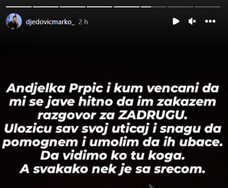 - Anđelka Prpić i kum venčani da mi se jave hitno da im zakažem razgovor za Zadrugu. Uložiću sav svoj uticaj i snagu da pomognem i umolim da ih ubace. Da vidimo ko tu koga. A svakako nek je sa srećom - napisao je Đedović na Instagramu.