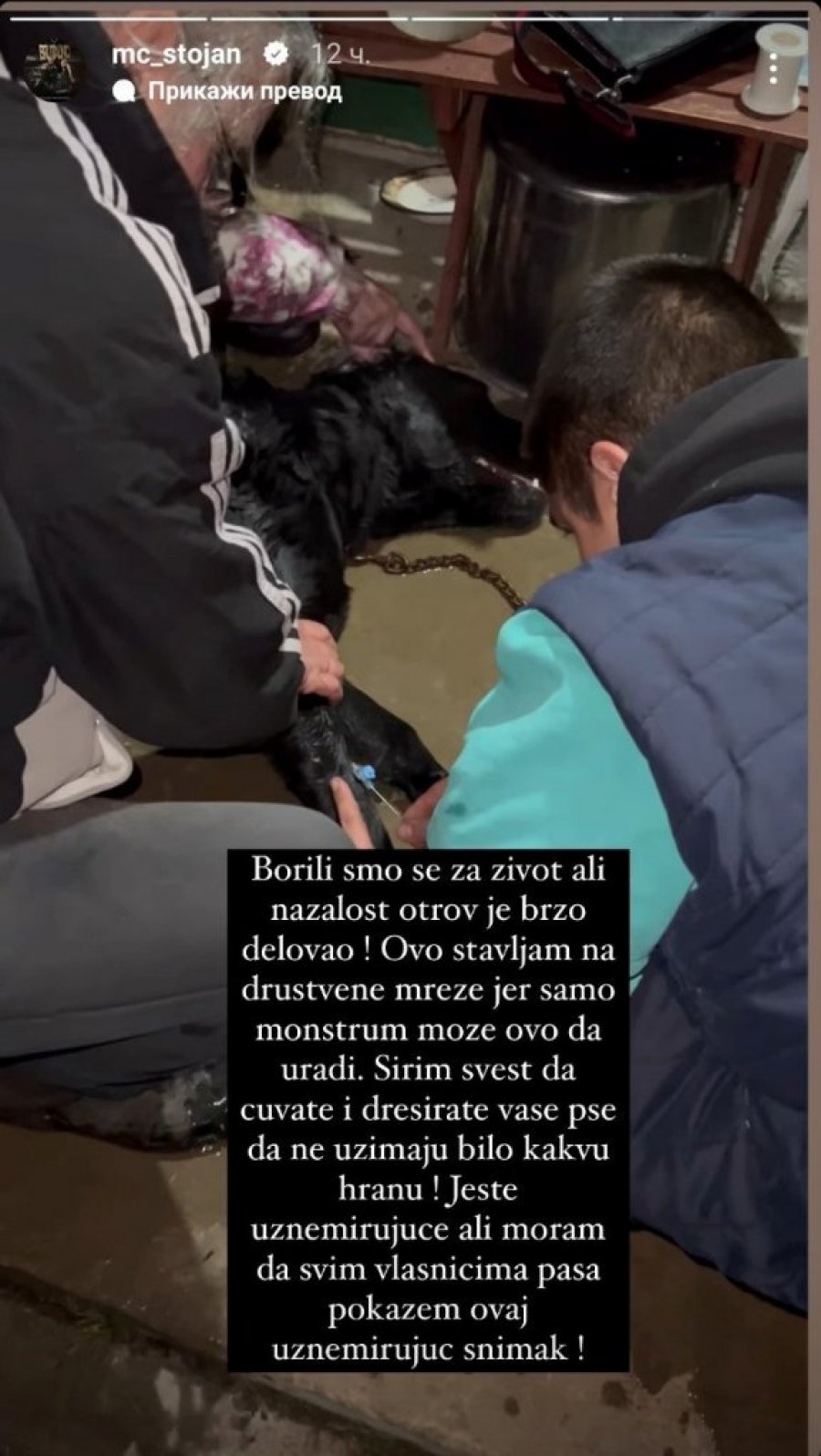 - Borili smo se za život, ali nažalost otrov je brzo delovao. Ovo stavljam na društvene mreže jer samo monstrum može ovo da uradi. Širim svest da čuvate i dresirate vaše pse da ne uzimaju bilo kakvu hranu. Jeste uznemirujuće, ali moram svim vlasnicima pasa da pokažem ovaj snimak - napisao je Stojan, pa dodao: