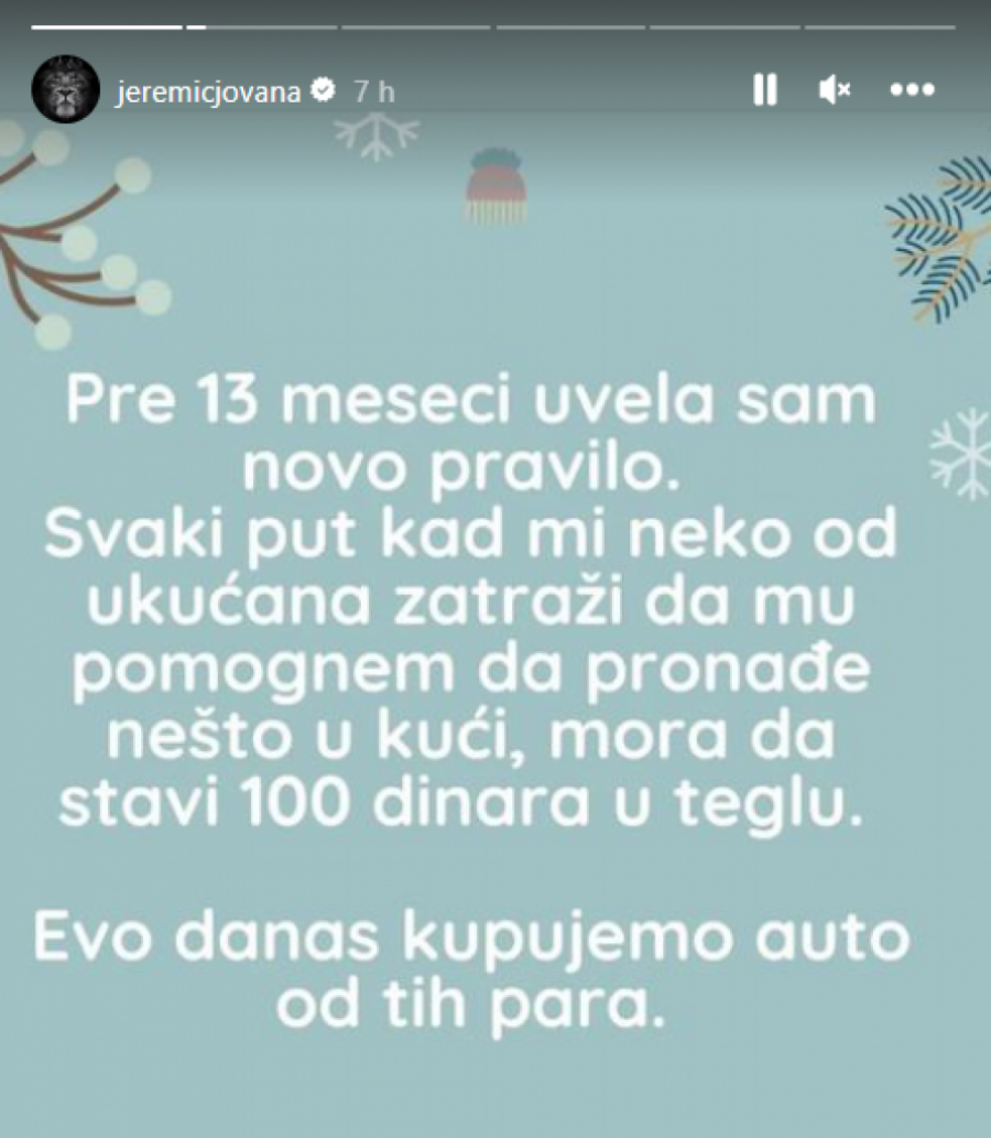 - Pre 13 meseci uvela sam novo pravilo. Svaki put kada mi neko od ukućana zatraži da mu pomognem da pronađe nešto u kući, mora da stavi 100 dinara u teglu. Evo danas kupujem auto od tih para - podelila je Jeremićeva na Instagram storiju.