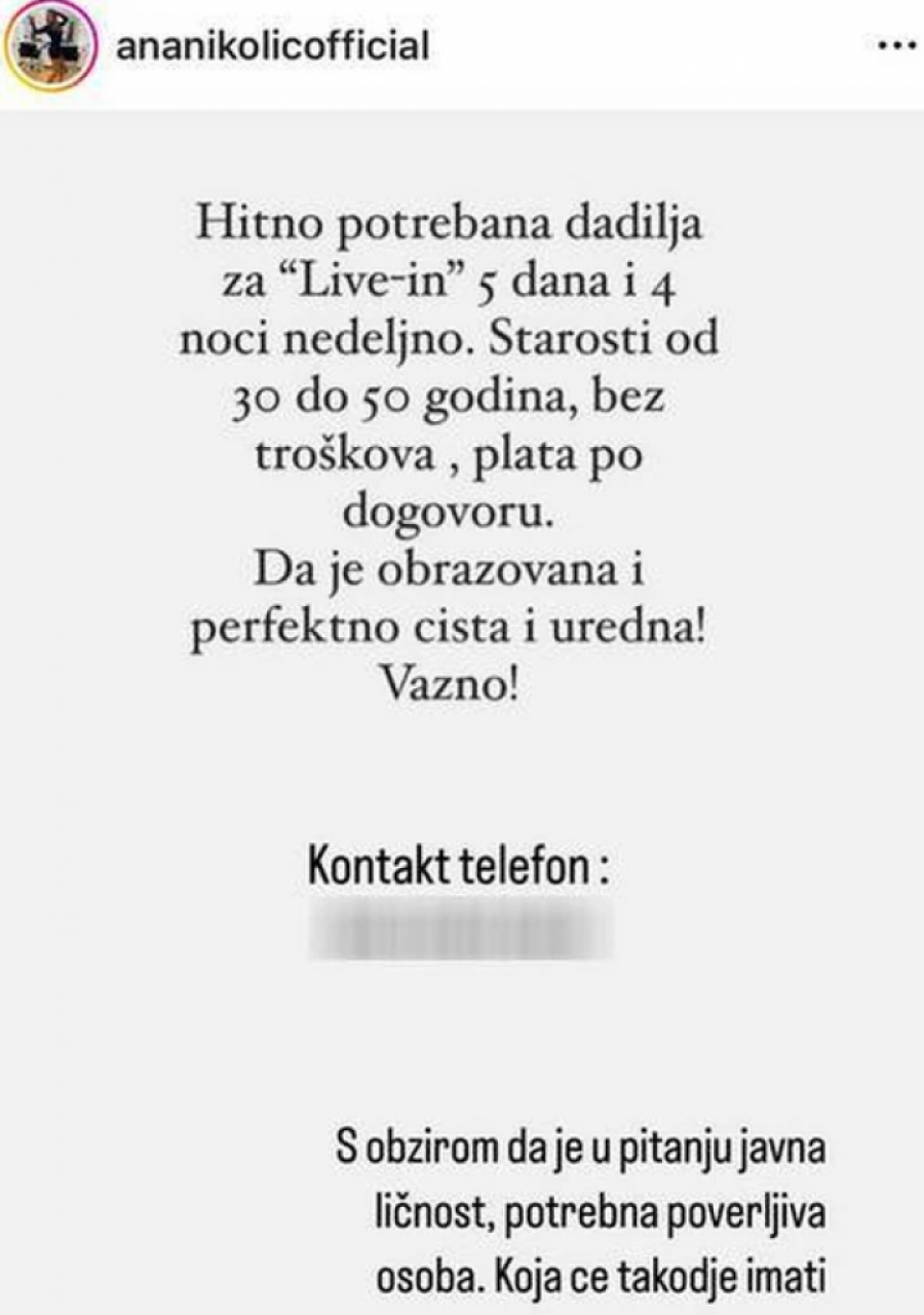 Podsetimo, Nikolićeva je nedavno na Instagramu tražila dadilju, što je sve šokiralo.