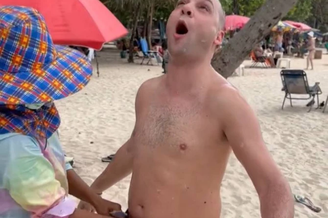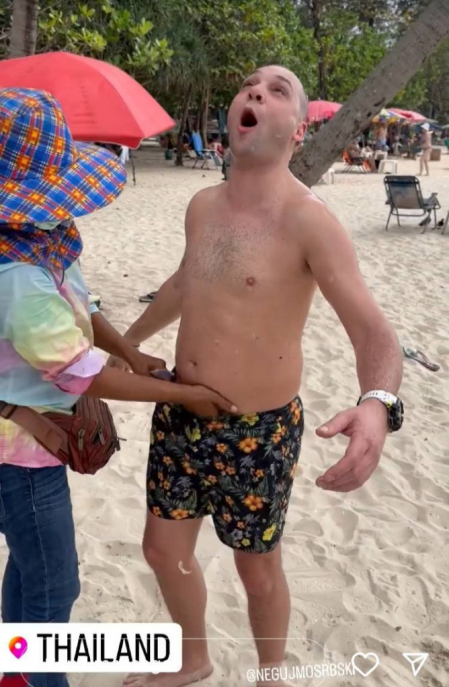 On se podvrgao tretmanom alojom na plaži, a Tajlanđanka ga je na licu mesta mazala i mazila po telu. Ona je krenula od ruku, potom po telu i licu, a onda mu je ruku zavukla u gaće, što je njega raspametilo u sekundi.