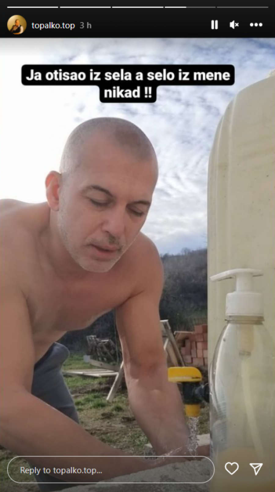 Naime, on je otišao u jedno selo, gde se prepustio seoskim poslovima, sa kojima se pohvalio na Instagram profilu. Kako je on veliki radnik i domaćin, Topalko je kao pravi muškarac poslagao drva, a potom se umio na prirodnom izvoru, koji je on nazvao ,,seoski džakuzi".
