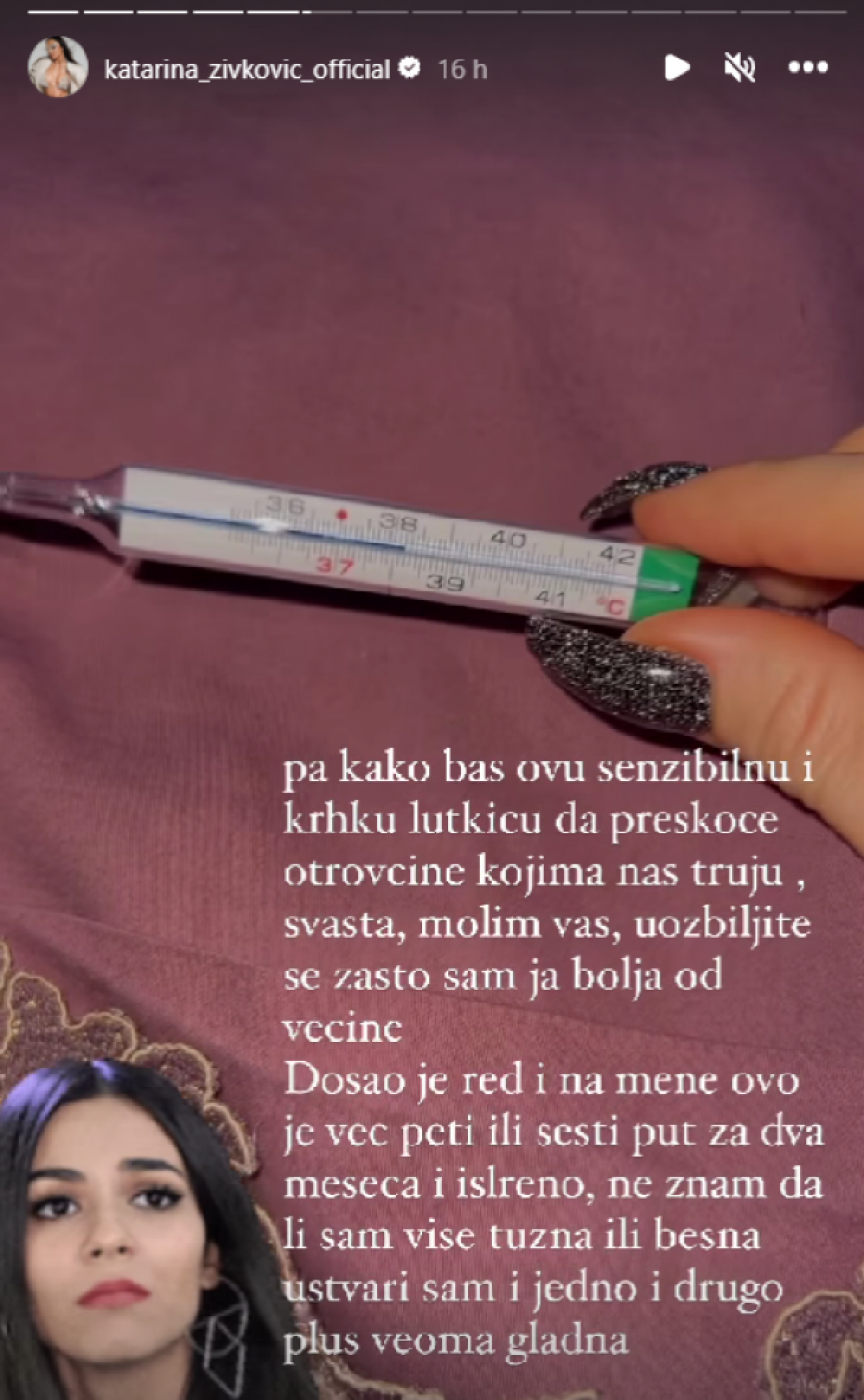 Pevačica Katarina Kaća Živković na društvenoj mreži Instagram objavila je stori na kom je otkrila da se otrovala hranom, zbog čega je dobila visoku temperaturu i nije joj dobro.