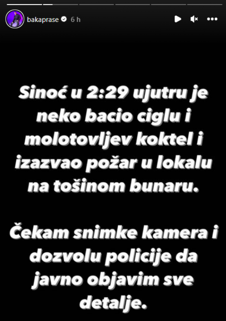 - Sinoć u 2:29 ujutru je neko bacio ciglu i molotovljev koktel i izazvao požar u lokalu na Tošinom bunaru - započeo je Baka, pa dodao:
