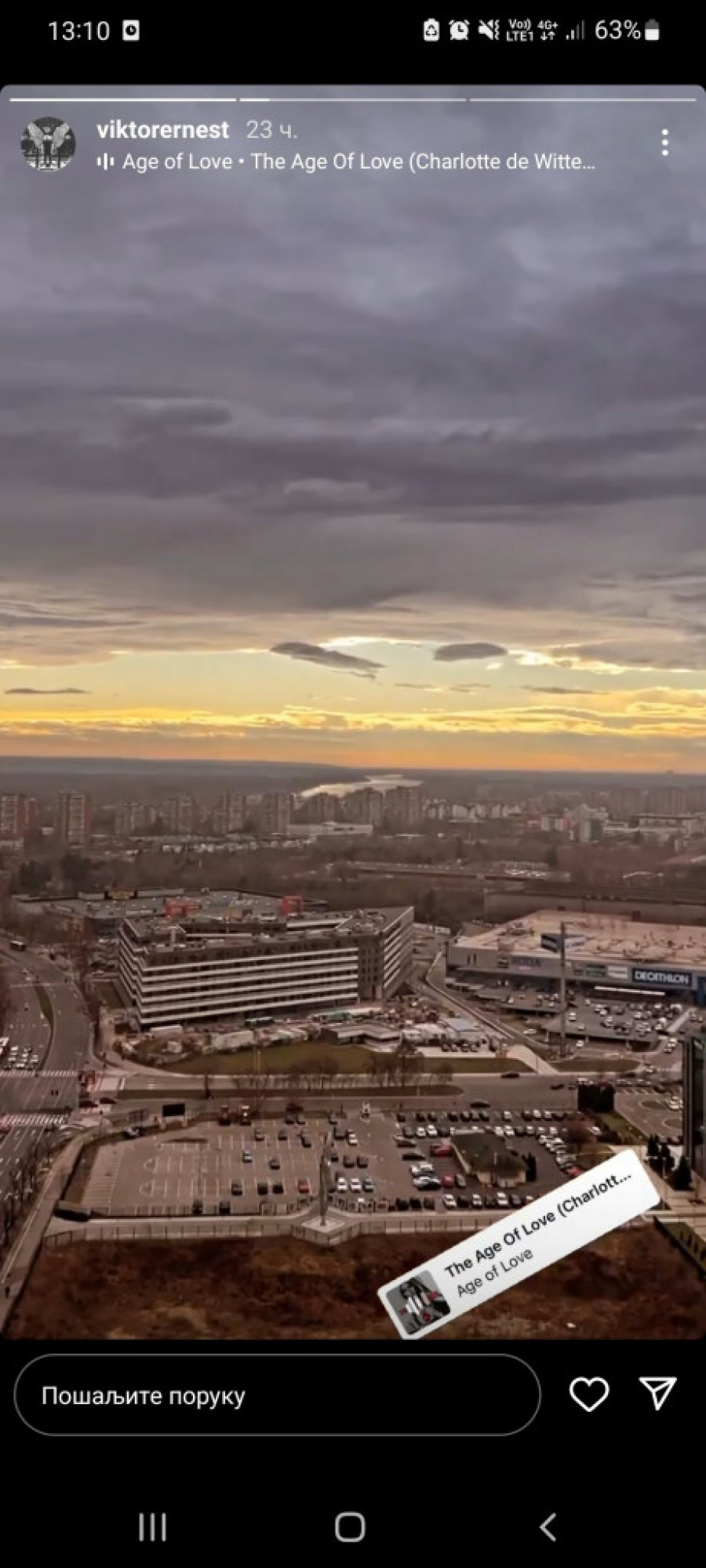 Najmlađi Živojinović je na storiju prvo objavio nestvaran pogled koji se sa 40. sprata pruža na čitav Novi Beograd, a poseban akcenat bio je na zalasku sunca i reci Savi.