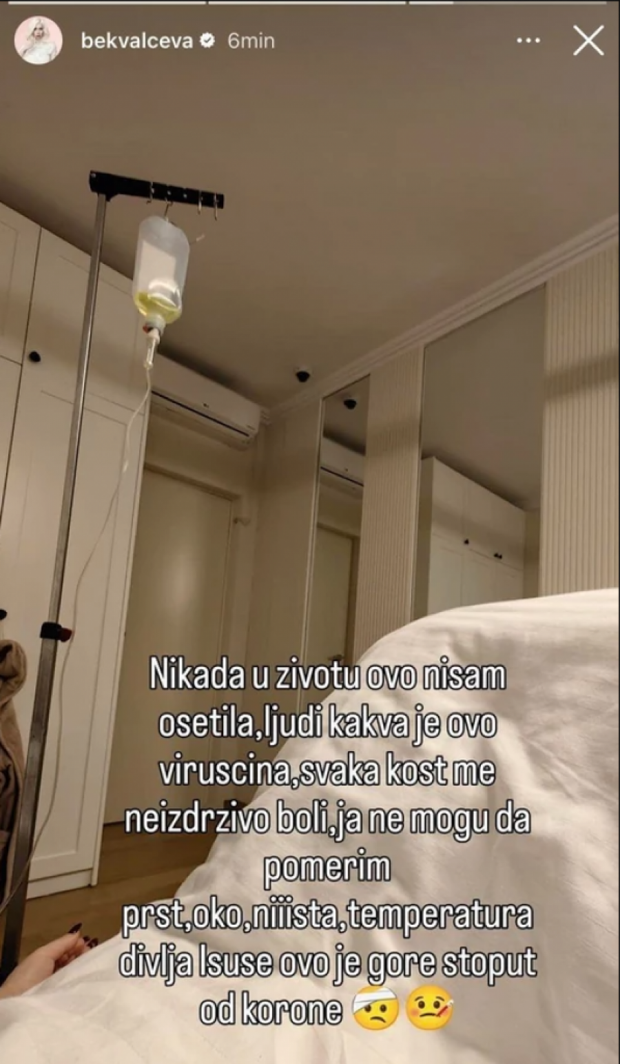- Nikada u životu ovo nisam osetila. Ljudi, kakva je ovo virusčina, svaka kost me neizdrživo bolim ja ne mogu da pomerim prst, oko, ništa... Temperatura divlja. Isuse, ovo je gore sto puta od korone - napisala je Nataša.