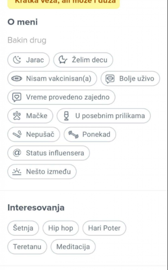 Inače, kao što se može primetiti iz priloženog, jutjuber ima verifikovan profil, što govori da nije lažnjak u pitanju. Tinder je aplikacija koja pored traženja srodne duše služi korisnicima i za neke opuštenije varijante, a da li je jutjuber zaista uspeo da nešto "upeca" vreme će pokazati.